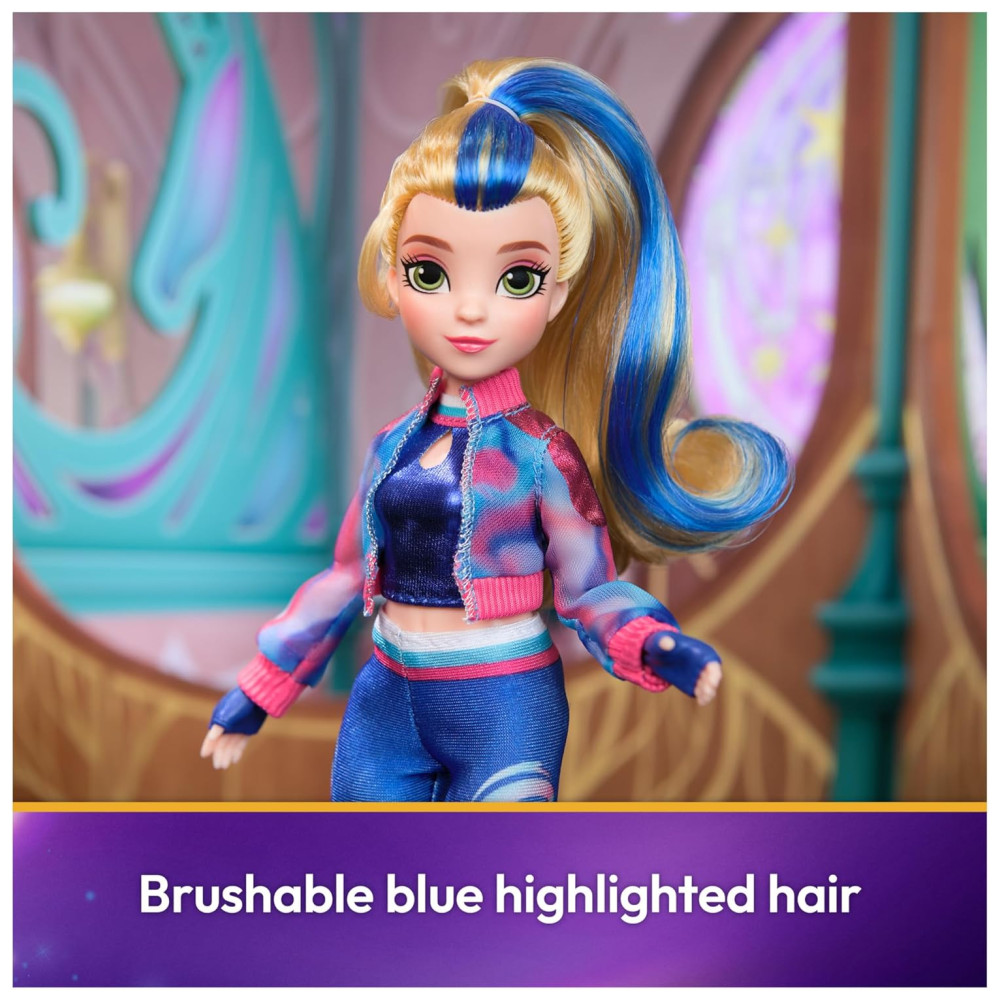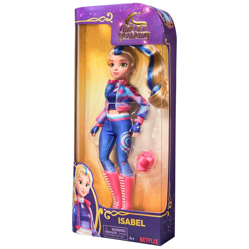 Leve para casa a magia da Academia Unicórnio com a Boneca Isabel Ela é baseada nos populares livros infantis mais vendidos da NETFLIX e possui cabelo macio e 9 pontos de articulação para poses infinitas Ela vem com acessórios autênticos, como o cabelo com mechas azuis, roupas esportivas, jaqueta curta com faixas, calças de montaria e botas.