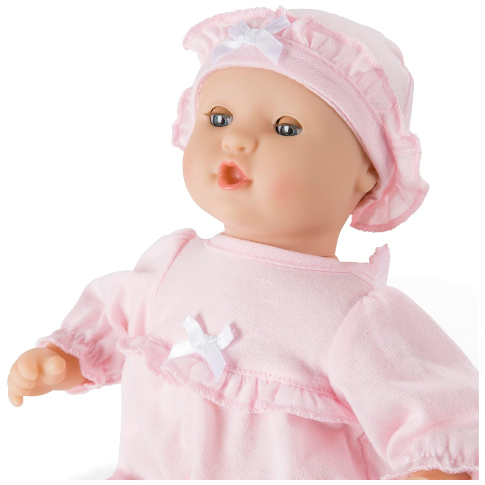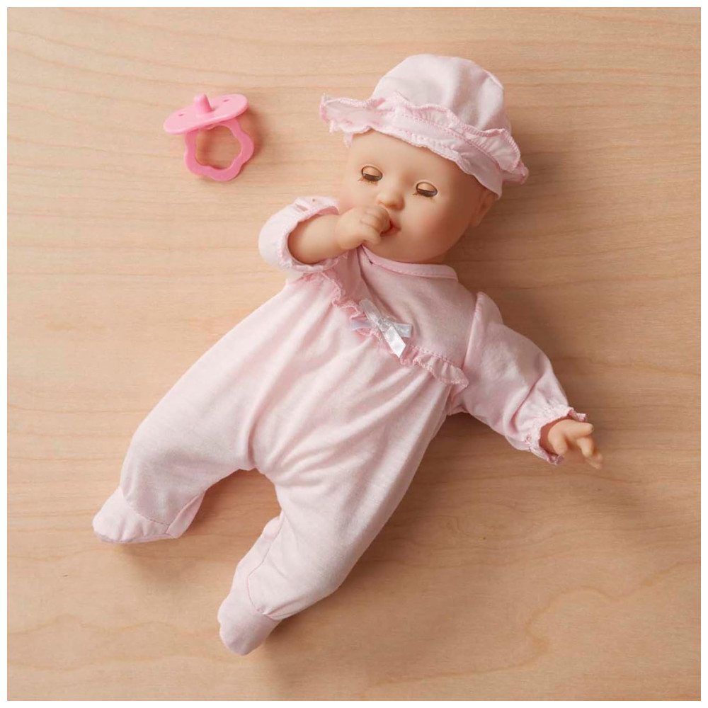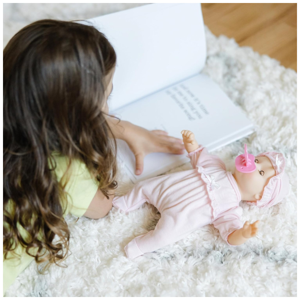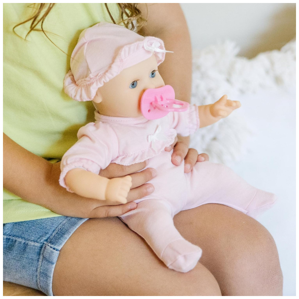 A boneca Jenna é uma escolha perfeita tanto para crianças quanto para adultos em busca de uma companhia fofa e cheirosa. Com um rosto doce e um corpo macio, ela veste um adorável conjunto rosa acompanhado por um boné combinando. Jenna possui olhos que abrem e fecham e pode segurar uma chupeta ou chupar o dedo, os quais estão inclusos.