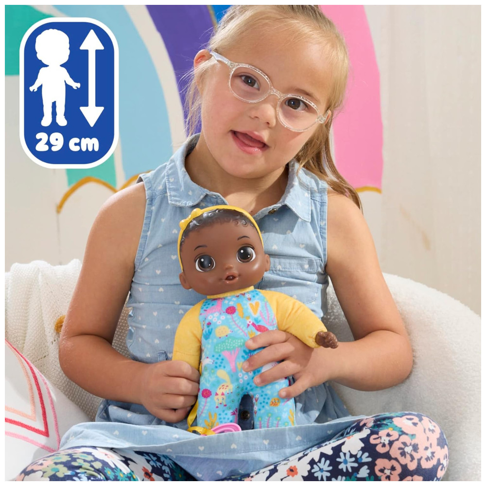 A boneca Baby Alive Soft n Cute é uma linda primeira boneca macia, perfeita para crianças de 18 meses ou mais. Com um corpo fofinho de 27 cm, ela é ótima para abraços na hora de dormir. Ela vem vestindo um macacão com tema de animal e uma faixa amarela com laço bem preso. Os pequenos vão adorar o acessório de boneca mordedor que parece um urso.