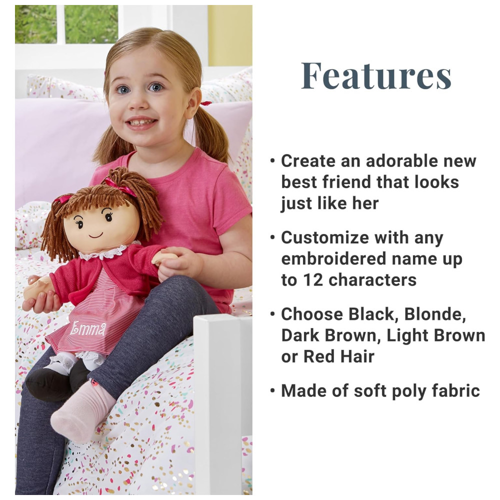 UMA AMIGA PARA A VIDA INTEIRA! Ideal para o Natal! Imagine todas as aventuras que sua pequena terá com uma boneca que pode ser personalizada para se parecer com ela! Esta boneca de pano certamente será sua companheira constante. PERSONALIZAÇÃO ÚNICA Escolha a cor do cabelo entre castanho escuro, loiro, castanho claro, preto ou vermelho. Personalize esta boneca fofa com qualquer nome bordado. UMA VERSÃO ATUALIZADA DE UM CLÁSSICO A tradição de brincar com uma boneca de pano remonta a muitos anos, mas esta versão moderna com certeza irá encantar. Cheia de personalidade e cuidadosamente trabalhada nos detalhes, é uma peça para ser guardada! QUALIDADE PREMIUM Esta boneca de pano de 38cm de altura, com olhos brilhantes, é feita de 100% poliéster macio e fofo. Limpeza local. Adequada para crianças a partir de 3 anos. Importada para fabricação final localmente. UM PRESENTE ADORÁVEL Não importa para qual criança você está comprando – filha, sobrinha, neta ou amiga da família – esta boneca de pano com certeza será um sucesso no Natal, aniversários ou apenas porque sim.