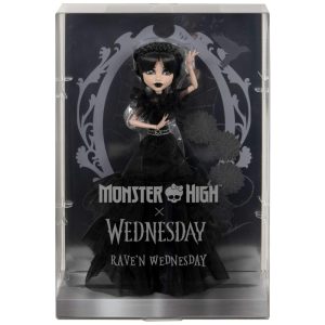 A Monster High Rave’N Wednesday Doll HXJ03 é uma colaboração exclusiva entre Monster High e a série Wednesday da Netflix, capturando o visual marcante da personagem na famosa cena do baile viral. A boneca usa um vestido preto transparente com várias camadas, com uma saia rodada para apresentações e saltos icônicos inspirados em gelo e yetis, refletindo a temática do baile.