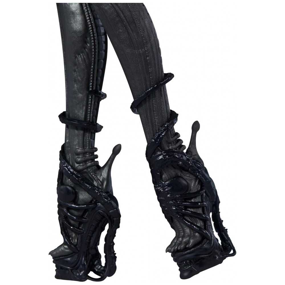 Os sapatos possuem salto inspirado no Facehugger, que complementa o visual aterrador e estilizado. A embalagem premium tem tema “Nostromo”, transportando colecionadores para o universo do filme.