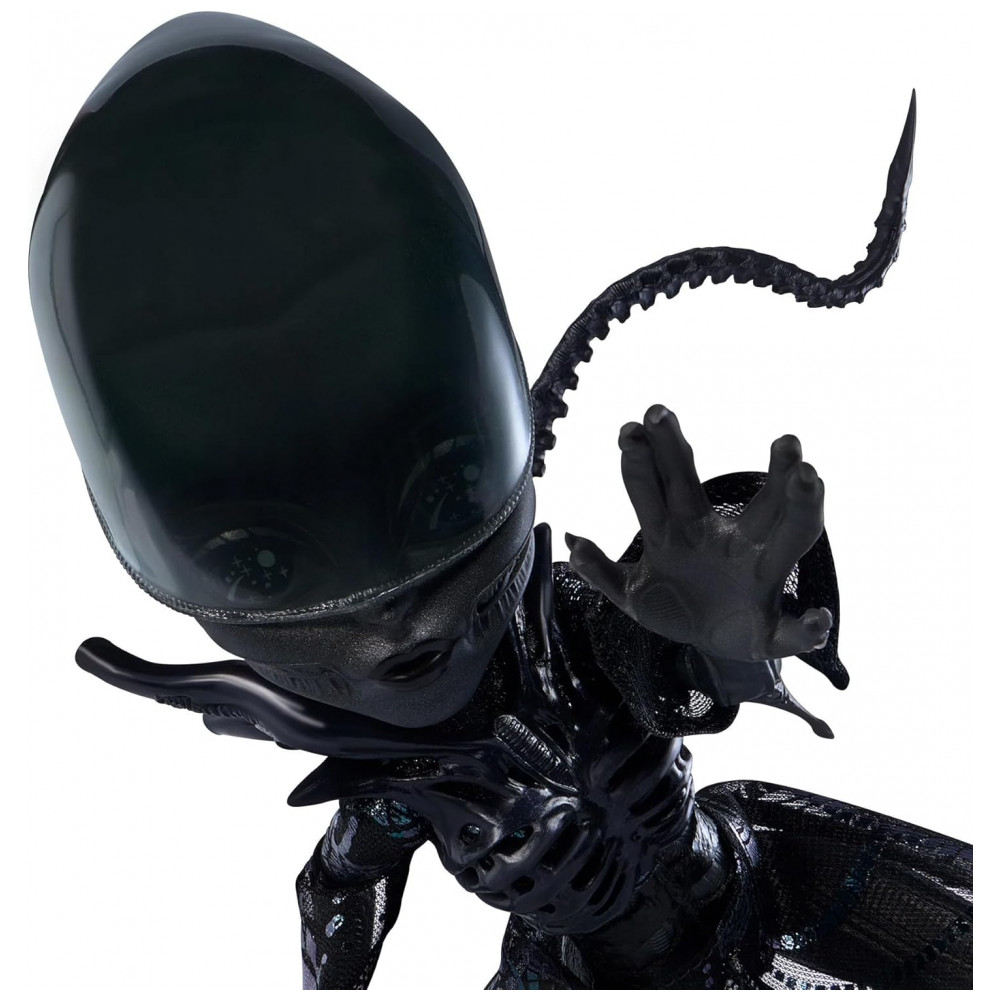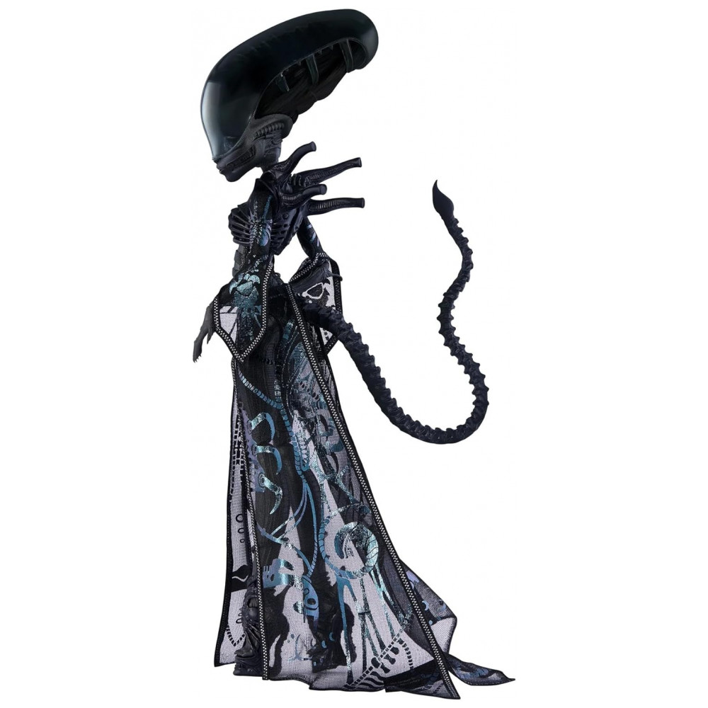 A boneca Monster High Skullector Alien tem 11 polegadas (aproximadamente 28 cm) de altura, 11 pontos de articulação e cauda flexível para poses dinâmicas. O design é inspirado no Xenomorph da franquia Alien, com esculturas detalhadas na face e corpo que remetem ao monstro original, vestindo um traje transparente preto com estampas iridescentes e um bodysuit de couro sintético.