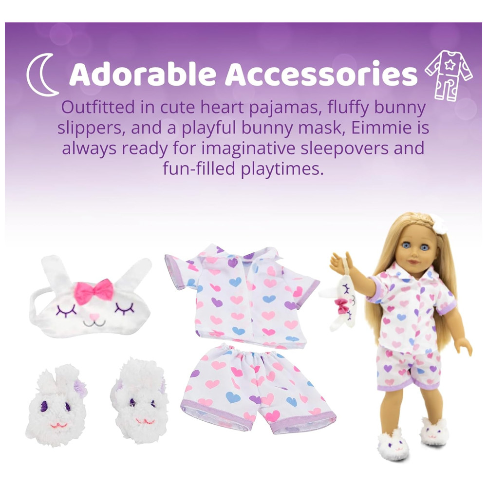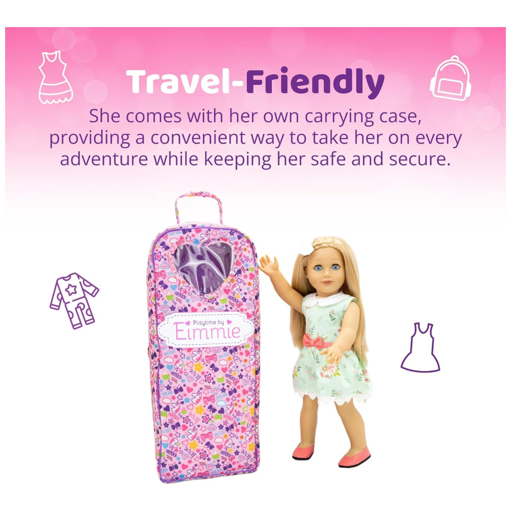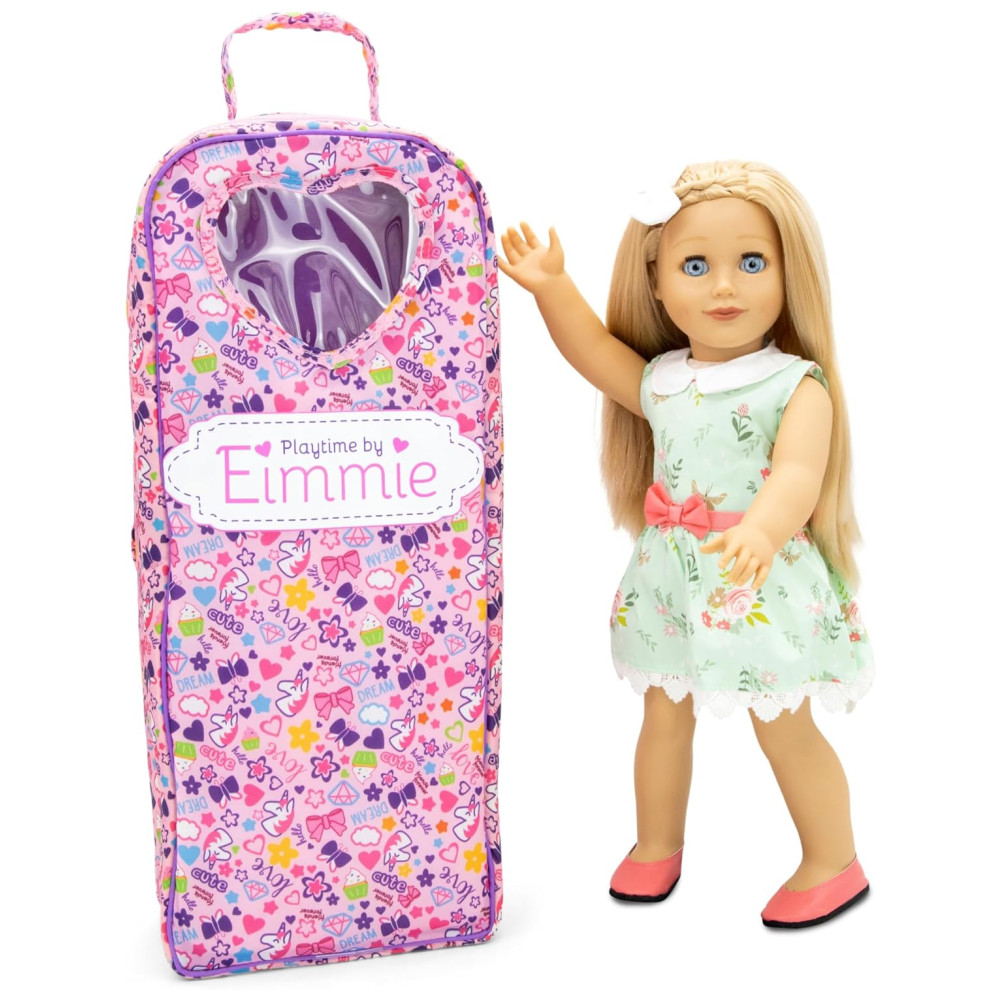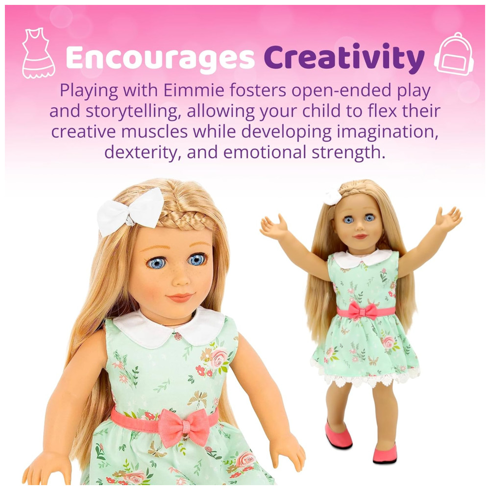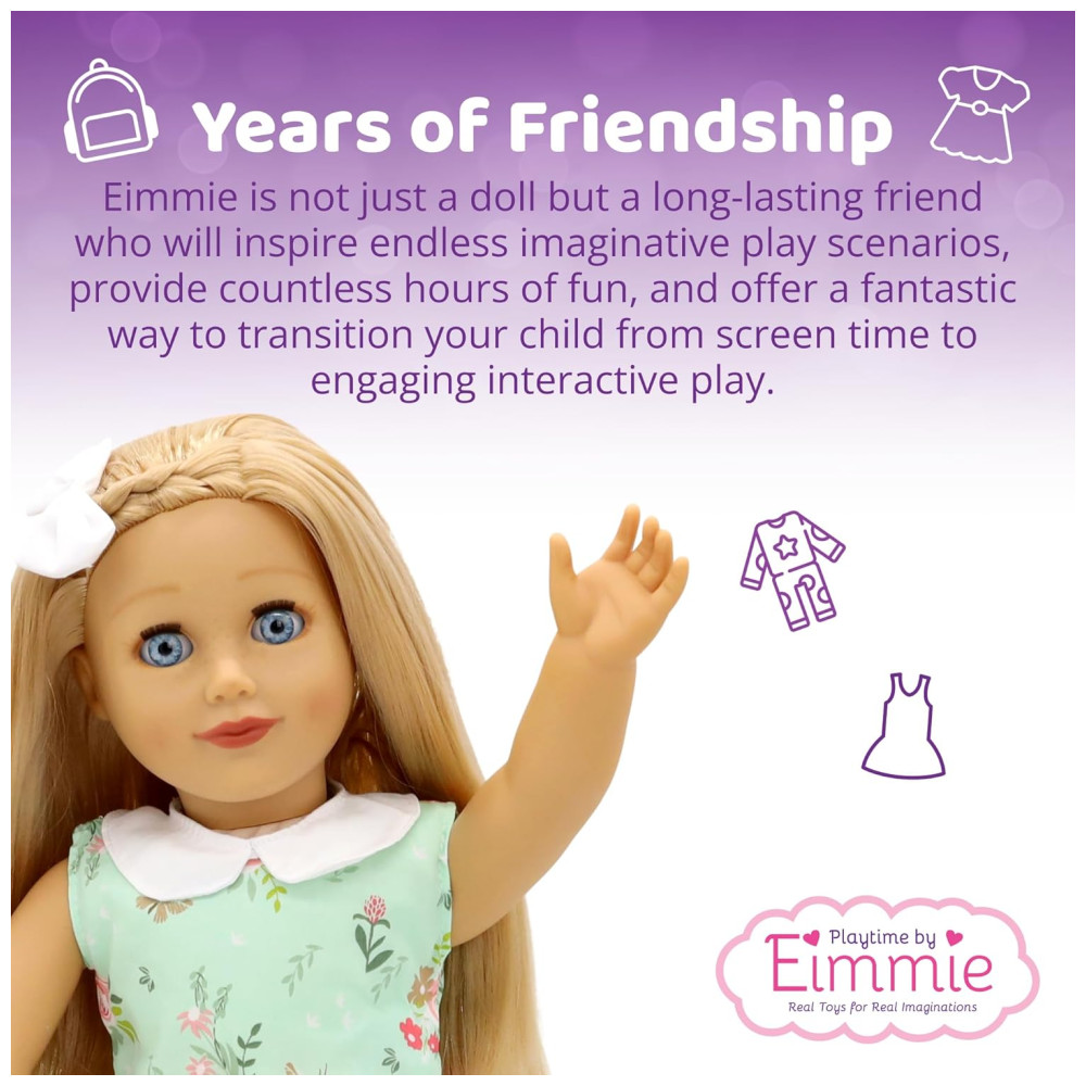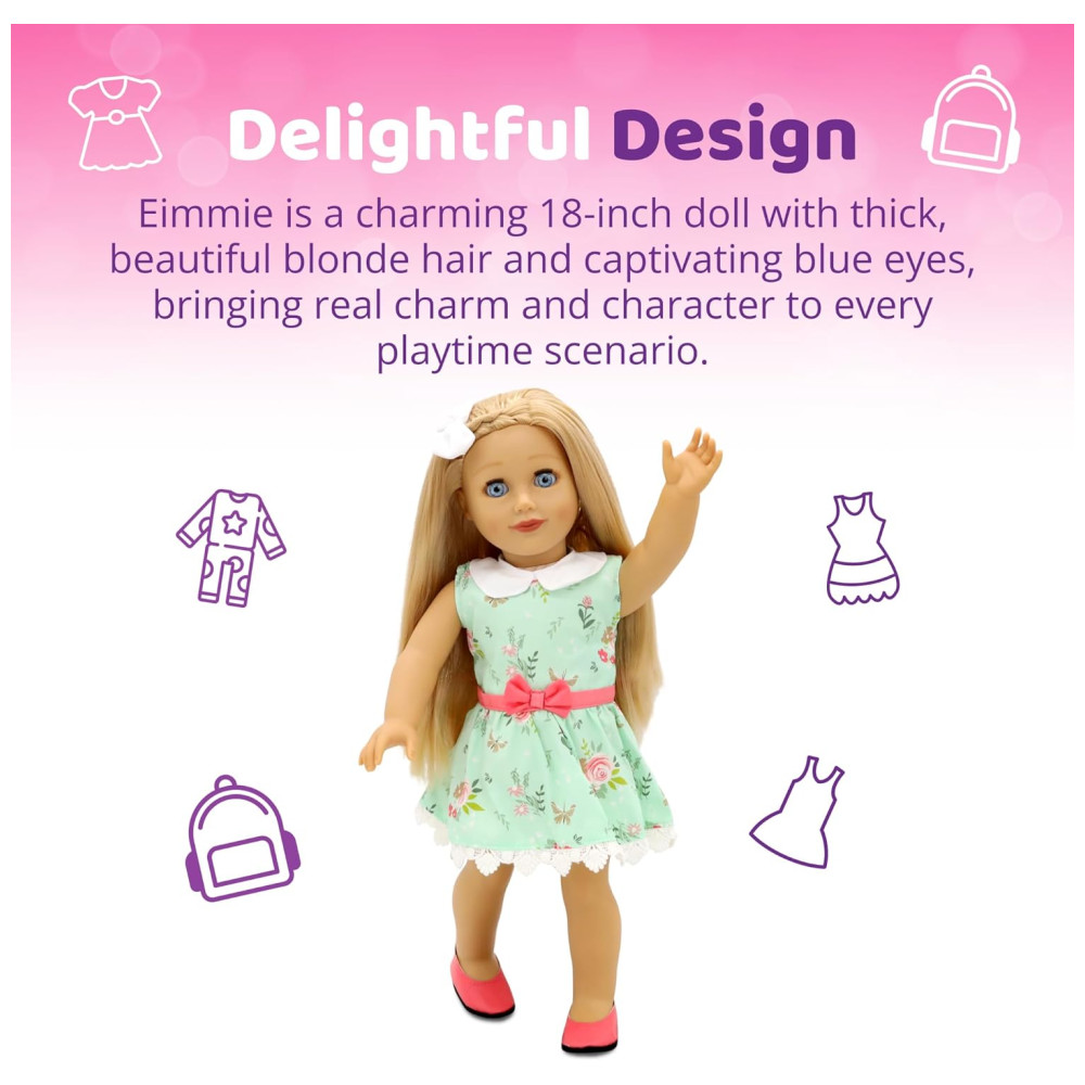 Bonecas com características realistas Eimmie tem cabelos loiros lindos, macios e grossos que podem ser penteados de qualquer maneira, um corpo macio e cheio para momentos de aconchego, olhos realistas, sardas e covinhas. Sua cabeça, braços e pernas se movem para várias poses.