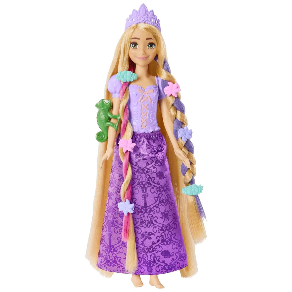 Esta boneca Rapunzel é inspirada na personagem animada da Disney e possui cabelos extralongos que podem ser estilizados de várias maneiras. O conjunto inclui 2 extensões de cabelo que mudam de cor com água morna, do roxo para o rosa ou do rosa para o azul, além de 9 peças de penteado e uma escova de frigideira. A boneca é articulada e usa uma tiara e seu vestido roxo característico, com uma saia macia e brilhante que é removível. A figura de Pascal, o adorável amigo camaleão de Rapunzel, também está incluída e pode ser presa em seu braço. Os fãs podem procurar a Torre Rapunzels e outros brinquedos Rapunzel para mais aventuras pelo reino Cada um vendido separadamente, sujeito a disponibilidade. É um presente perfeito para as crianças encenarem seus momentos favoritos do filme ou inventarem suas próprias aventuras com Rapunzel