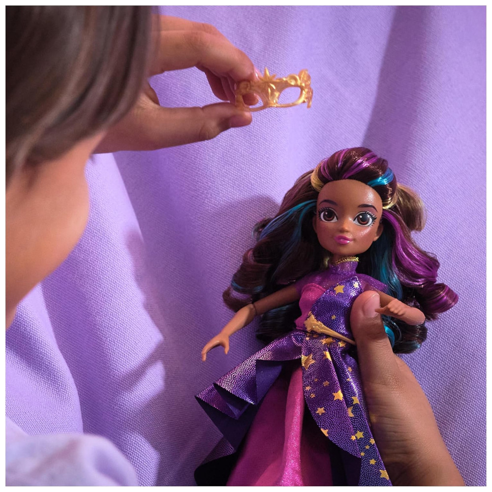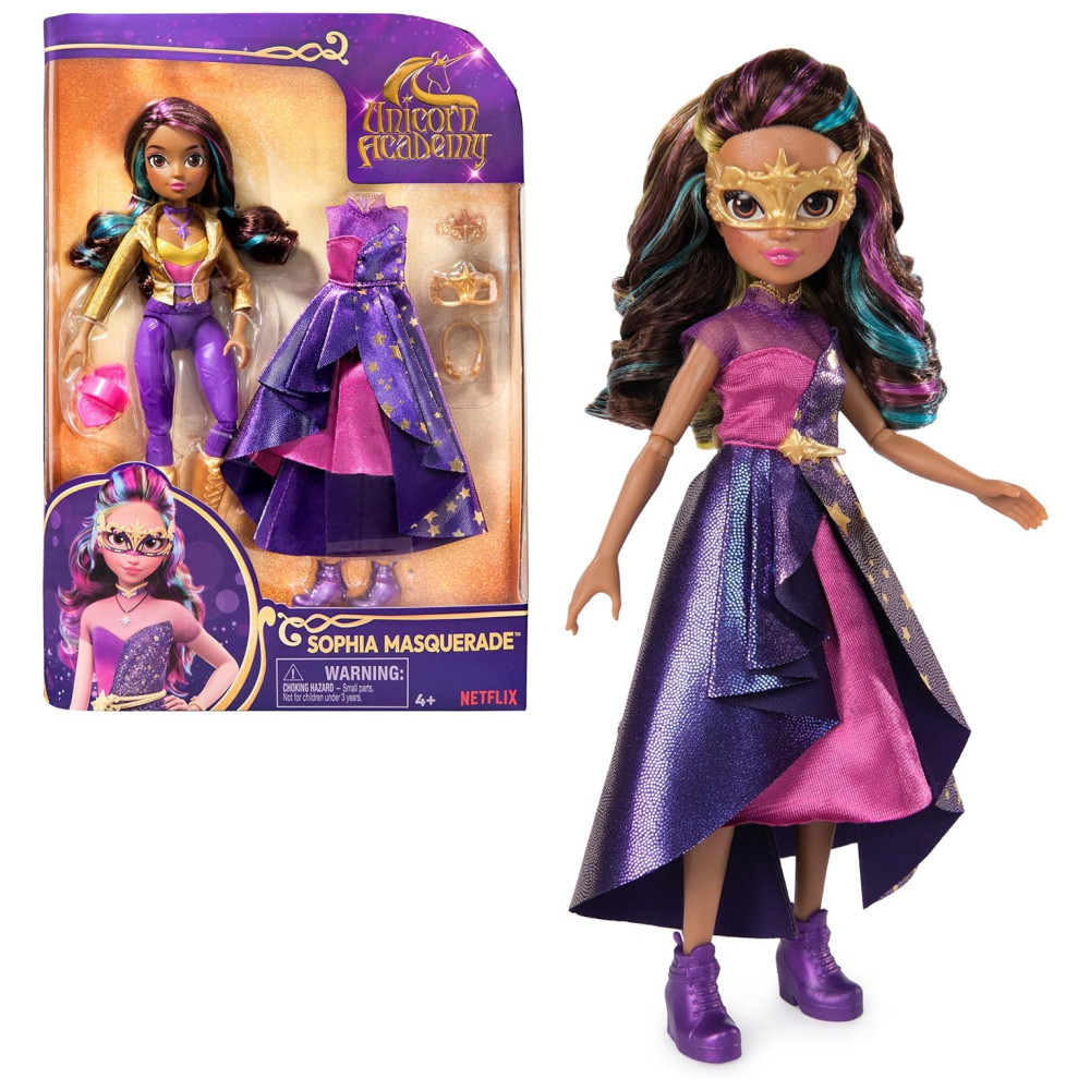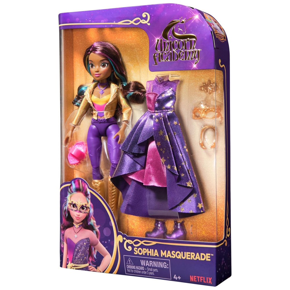 Leve para casa a boneca de luxo Sophia Masquerade da Unicorn Academy Com roupas autênticas, cabelo macio e 9 pontos de articulação, esta boneca deluxe oficial é baseada no popular programa infantil best seller da NETFLIX. Além disso, Sophia vem com 9 acessórios para boneca, incluindo um equipamento de montaria, roupas de boneca, jaqueta, botas, colar, vestido assimétrico, máscara, botinhas roxas com cinto dourado e uma ferramenta de modelagem de cabelo.