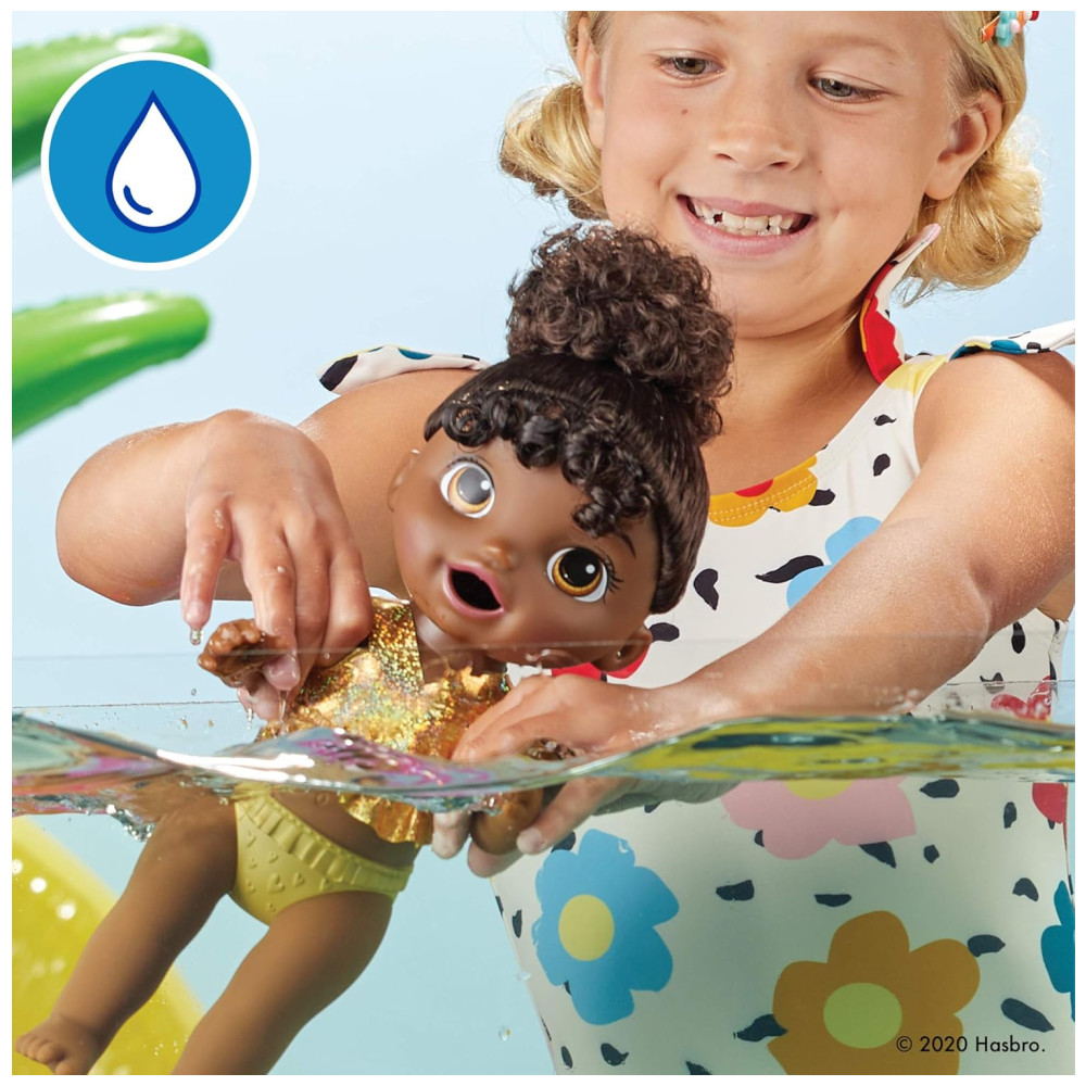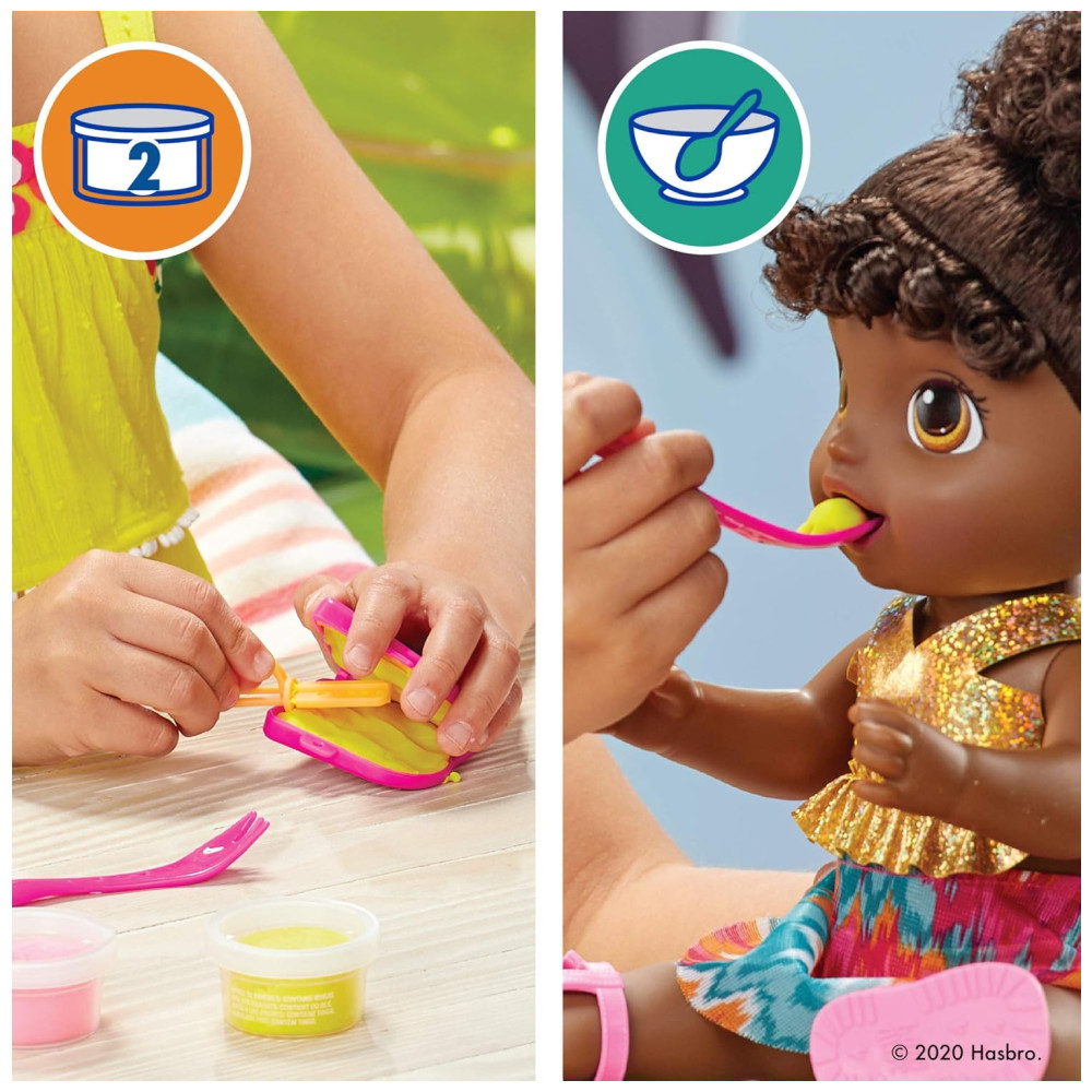 Para brincar dentro e fora da água, a Sunshine Snacks é a primeira boneca Baby Alive com alimentação e brincadeiras aquáticas Inclui uma blusa de maiô e sarongue removíveis, óculos de sol, sandálias gladiadoras, 2 recipientes sólidos de comida para boneca, molde e palito para picolé, combo de colher de garfo e pente.