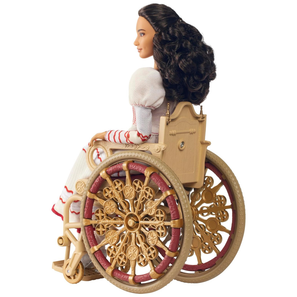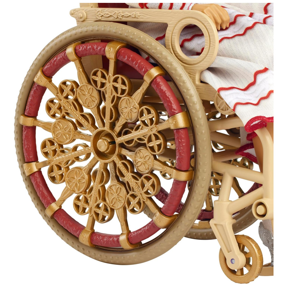 Nessarose veste seu deslumbrante vestido com mangas bufantes e costura vermelha, acompanhado de elegantes chinelos adornados com joias. Ela também vem com uma cadeira de rodas dourada, completa com rodas giratórias e detalhes ornamentados que capturam a essência do personagem.