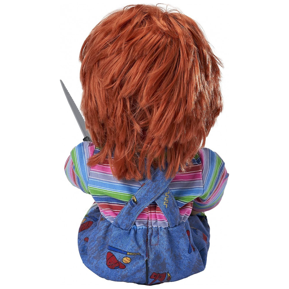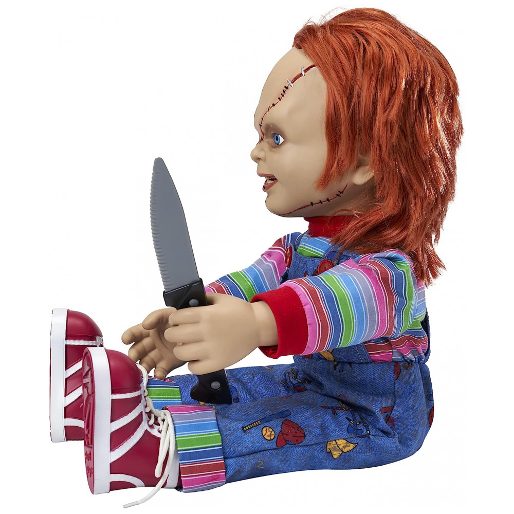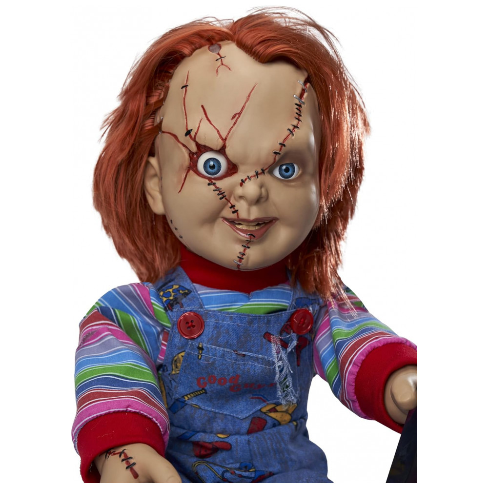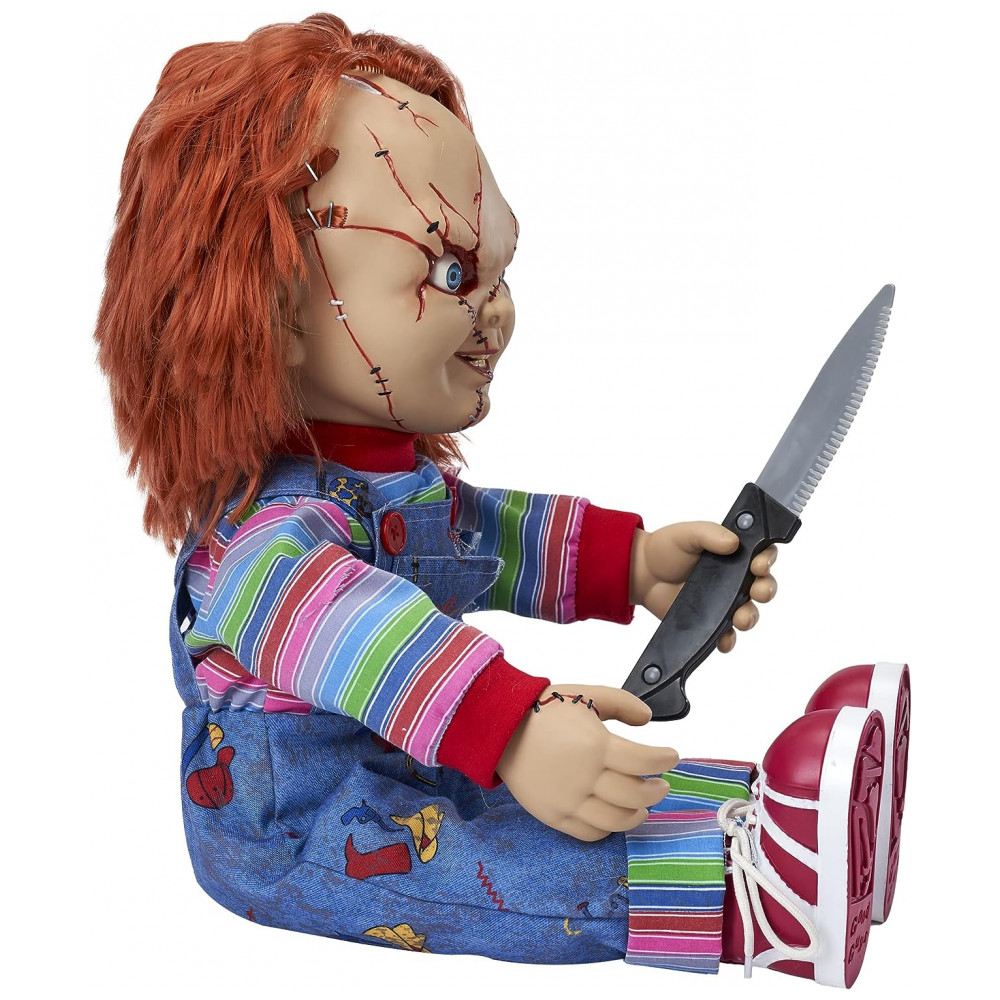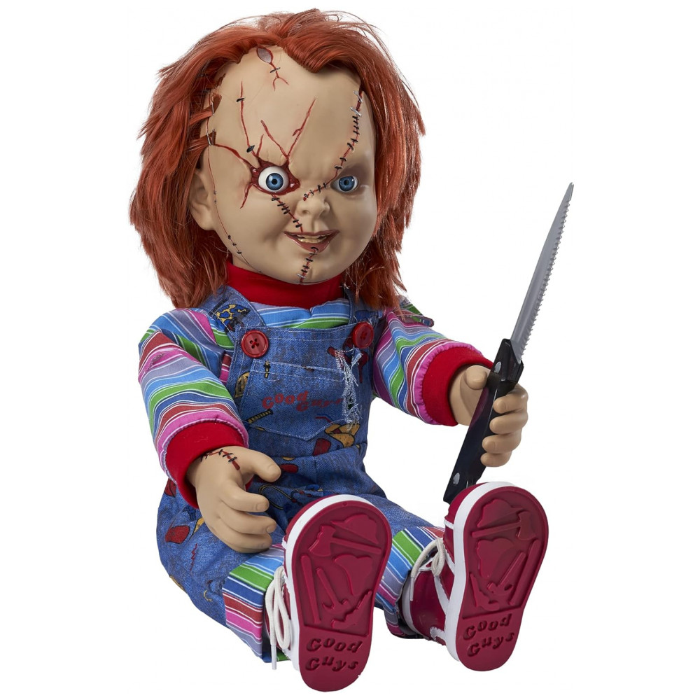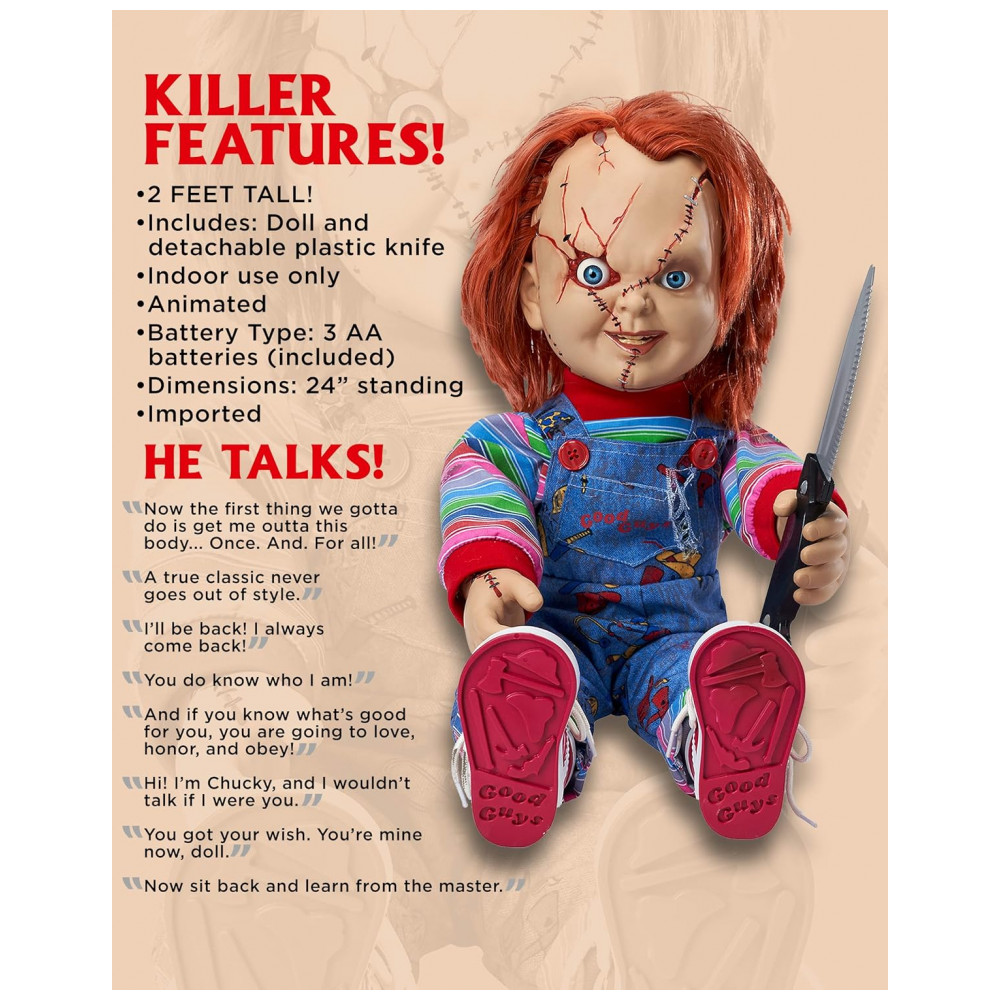 O boneco mais aterrorizante de todas, esta boneca falante do Chucky oficialmente licenciada captura cada detalhe horrível da boneca demente. Perfeita para fãs de filmes de terror ou para quem procura uma decoração mortal de Halloween, esta boneca assassina é o complemento perfeito. Ele está implorando para brincar com você e sua faca removível enquanto pronuncia algumas das falas mais famosas da série de filmes Childs Play. Tudo o que ele quer fazer é brincar