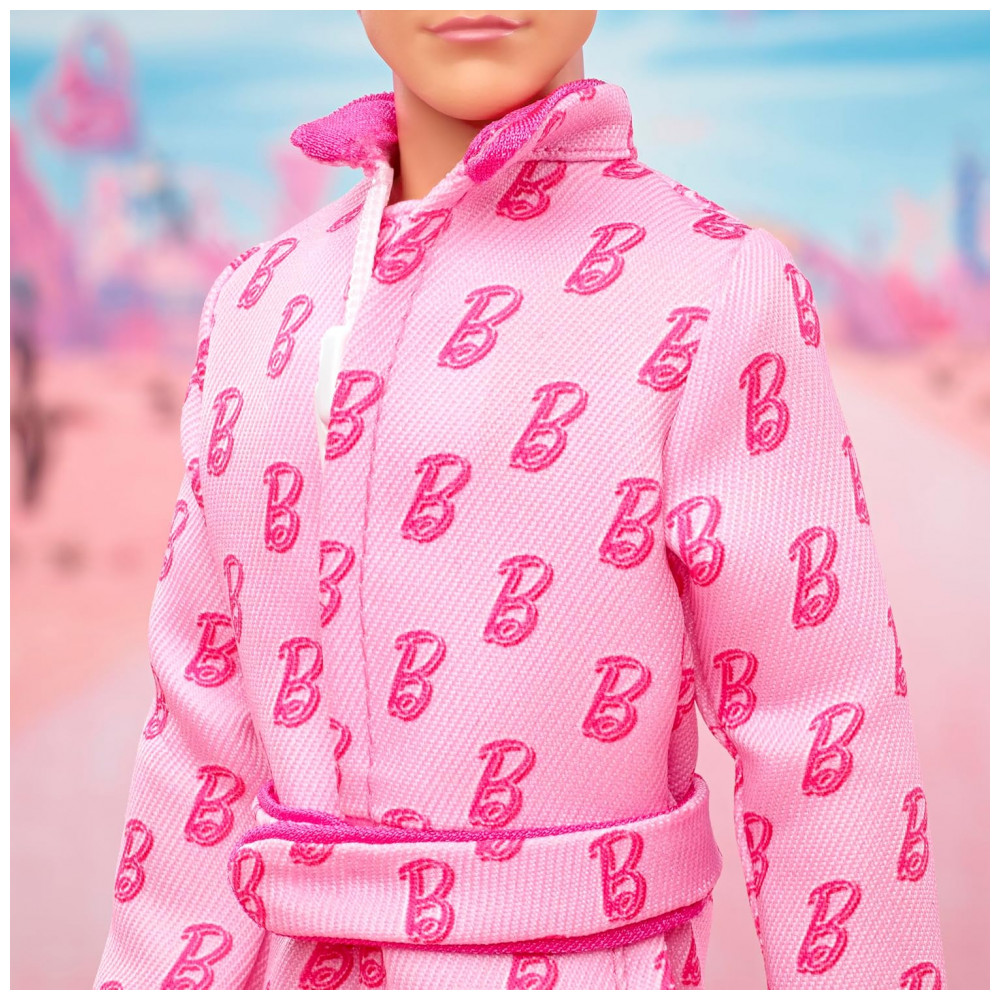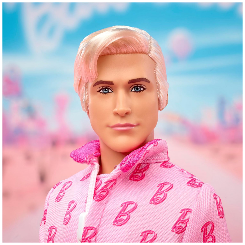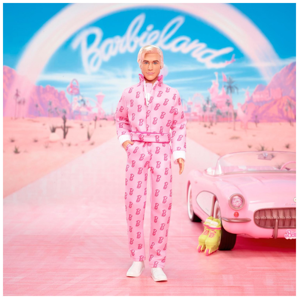 O boneco colecionável Barbie The Movie Ken representa o personagem de Ryan Gosling em uma das cenas marcantes do filme, com macacão rosa estampado com símbolos “B” e visual inspirado no look usado na ida ao “mundo real”. O corpo é articulado, adequado para poses de exposição em base expositora e para encenar movimentos de patinação e cenas reproduzidas do longa.