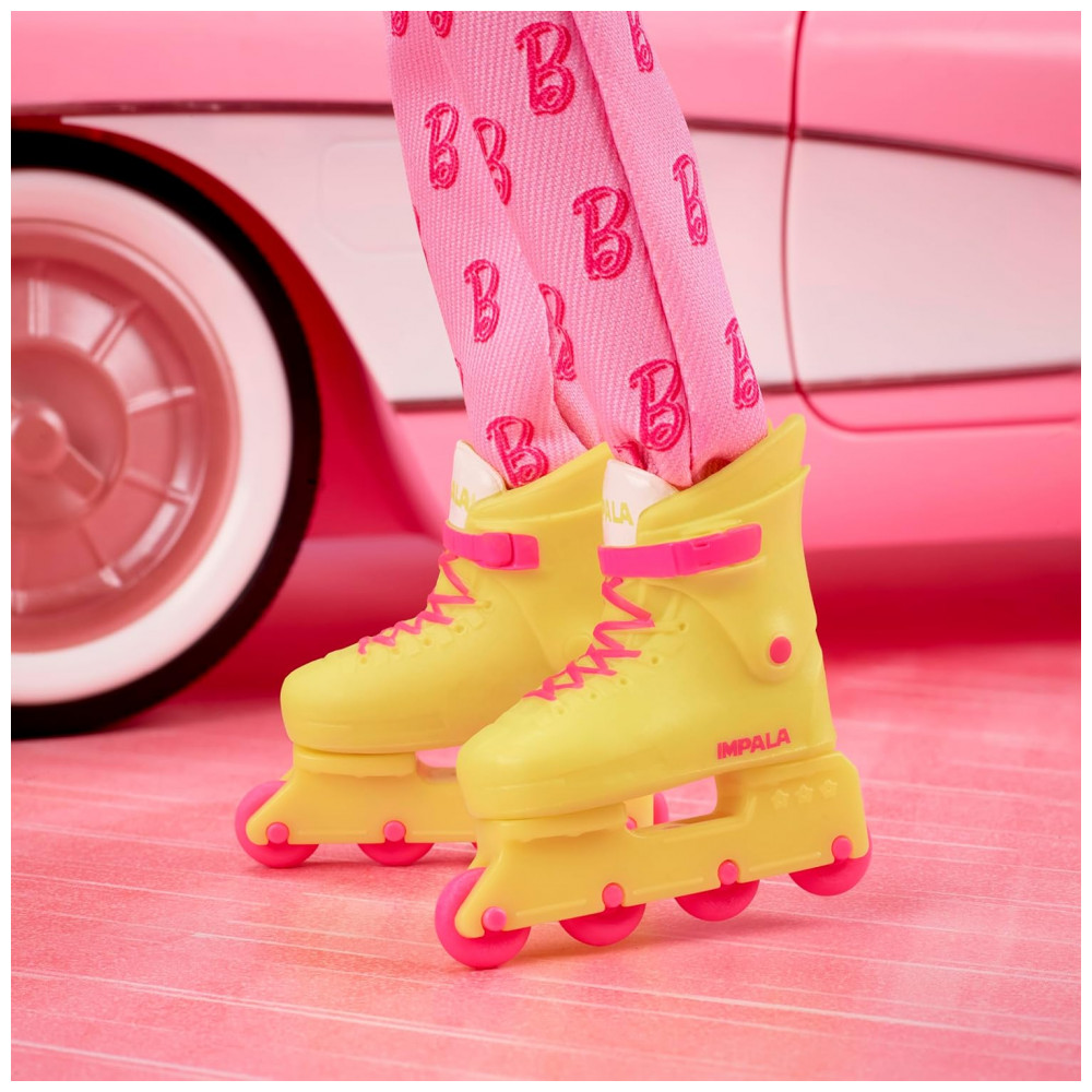 O traje principal é um macacão rosa de manga longa e perna comprida em tecido com aparência de brim, com estampa repetida do símbolo “B” da Barbie, fechamento frontal funcional em zíper e cinto de tecido com fecho metálico. O conjunto é complementado por tênis brancos, que podem ser usados sozinhos, e patins de rodas multicoloridos (amarelos com rodas rosas, em estilo inspirado no filme), que se encaixam sobre o calçado. O boneco apresenta cabelo loiro platinado em corte curto, aproximando a aparência da versão do personagem vista em Barbie Land.