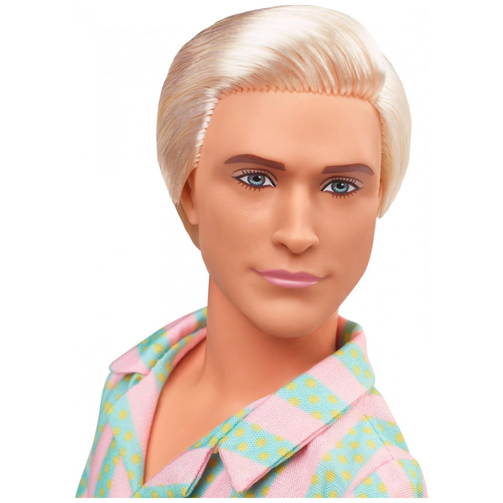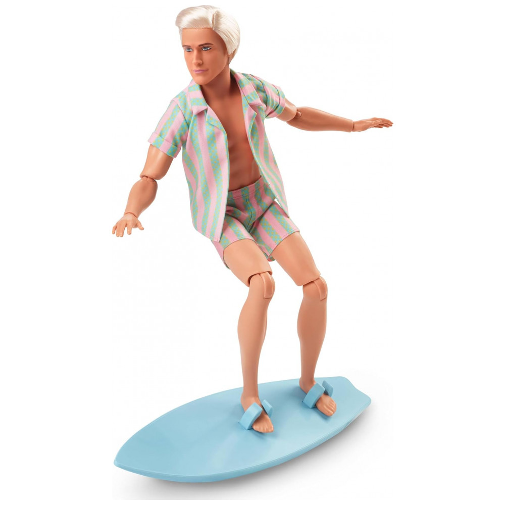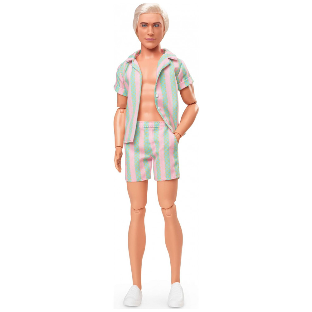 O boneco Ken Barbie The Movie traz o visual praiano do personagem no filme, com look listrado em tons pastel e prancha de surf. Ele usa camisa aberta com listras em rosa pastel e verde menta e shorts combinando com bolsos funcionais. O visual é completado por tênis brancos e cabelo loiro platinado, em estilo despojado de praia.