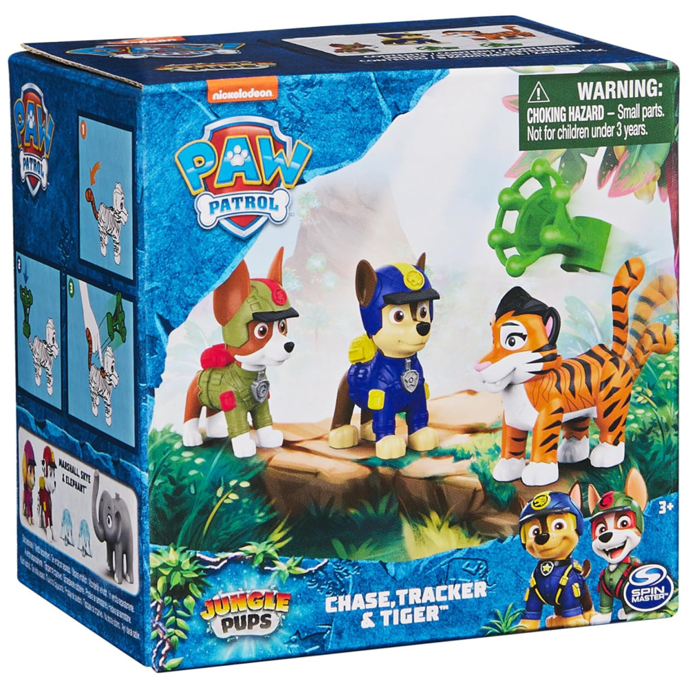 Explore aventuras emocionantes com o conjunto de figuras Jungle Pups Chase, Tracker e Tiger da Patrulha Canina Essas figuras pré escolares têm mais de 5 cm de altura e se parecem com os personagens do programa de TV. Quando há um resgate para ser feito, prenda o projétil de rede na cauda do tigre, puxe a cauda para trás e pressione o botão para lançar e salvar o dia Use sua imaginação para recriar suas cenas favoritas ou criar novas missões emocionantes.