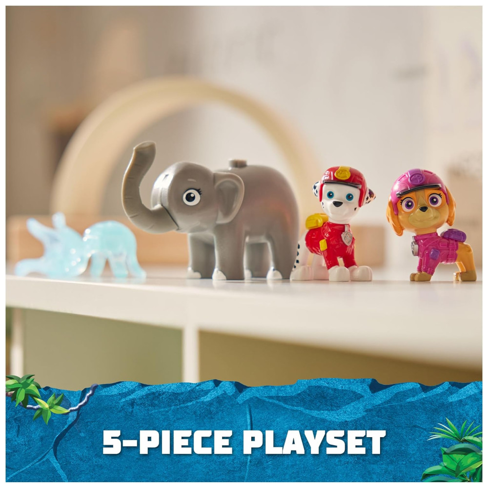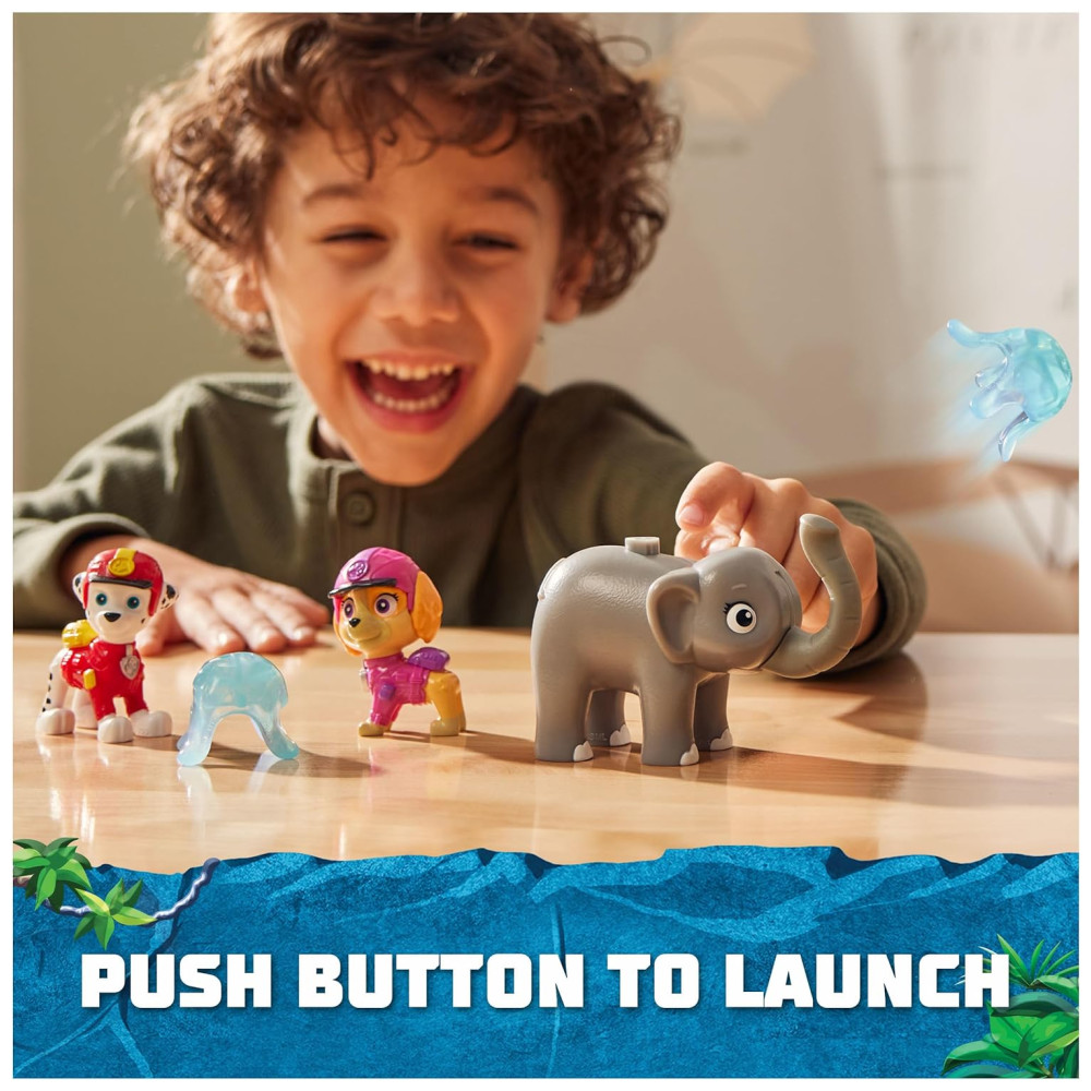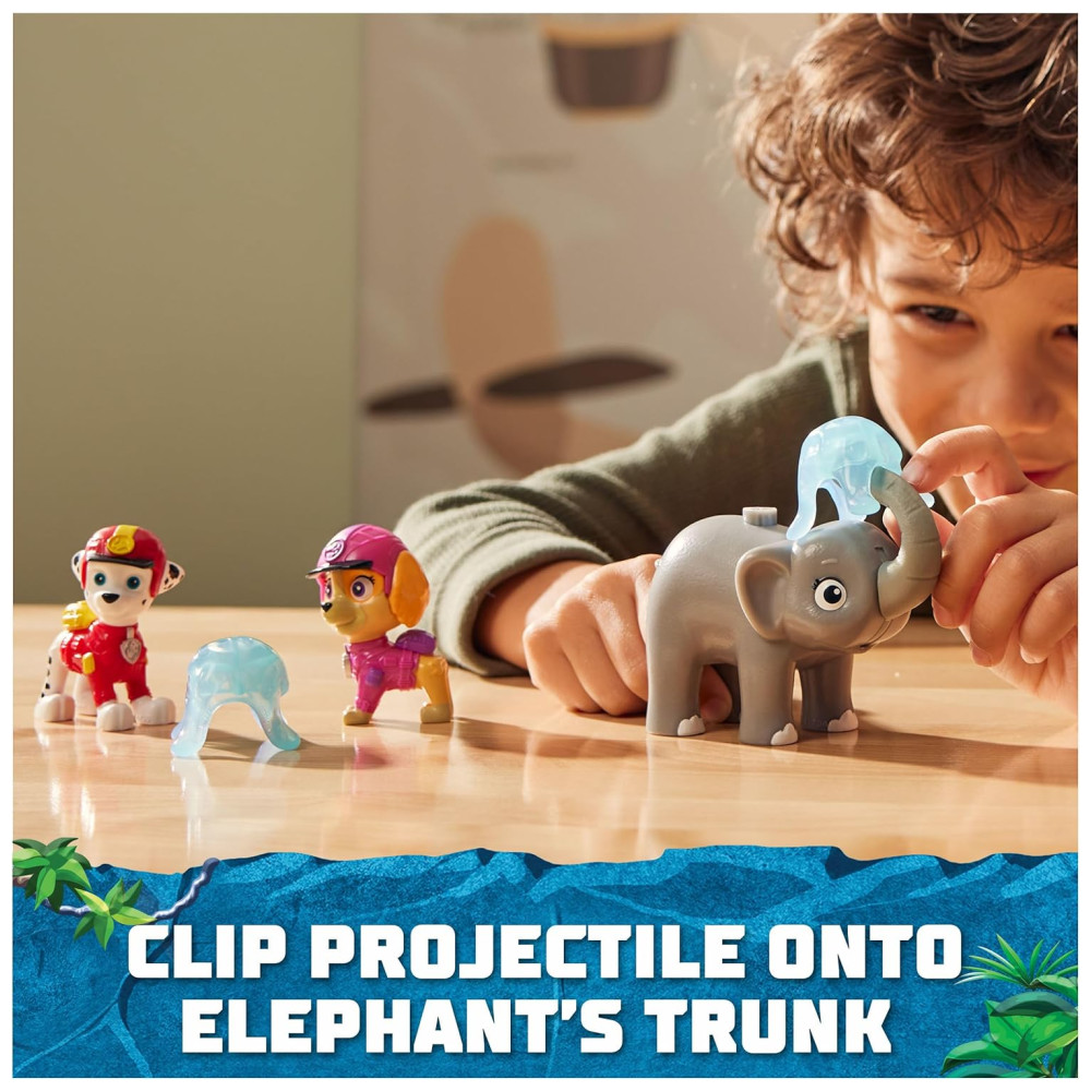 Crie aventuras emocionantes com as figuras pré escolares da PAW Patrol Jungle Pups, incluindo Marshall, Skye e um elefante amigo Com mais de 5 cm de altura, essas figuras são fiéis ao show, vestidas com seus uniformes e capacetes Jungle Pups. Para resgates empolgantes, prenda o projétil de água na tromba do elefante, puxe a para trás e pressione o botão para lançar. Deixe a imaginação fluir e recrie cenas favoritas da série ou crie novas missões de resgate.