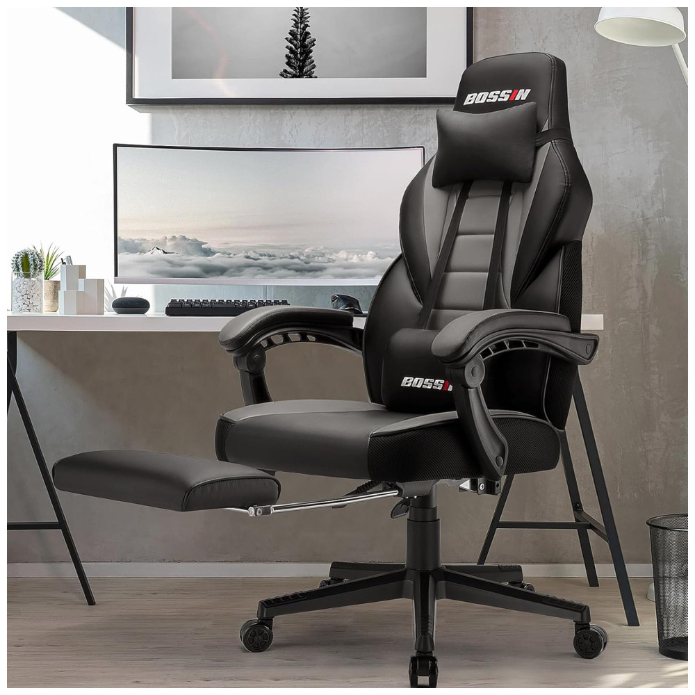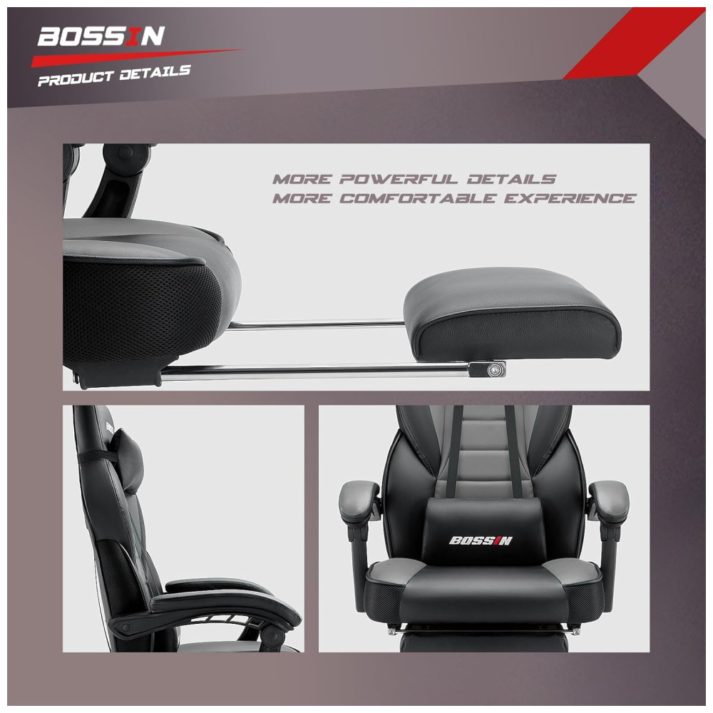 BOSSIN Cadeira de Escritório Gamer Reclinável e Ergonômica com Apoio para Lombar Cinza Claro