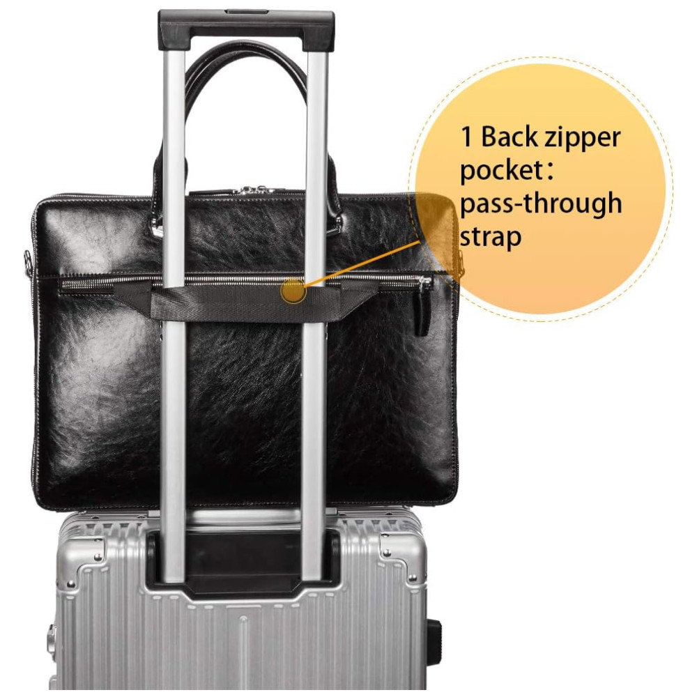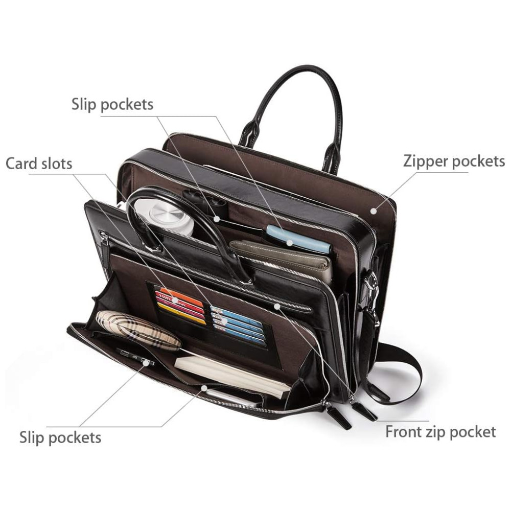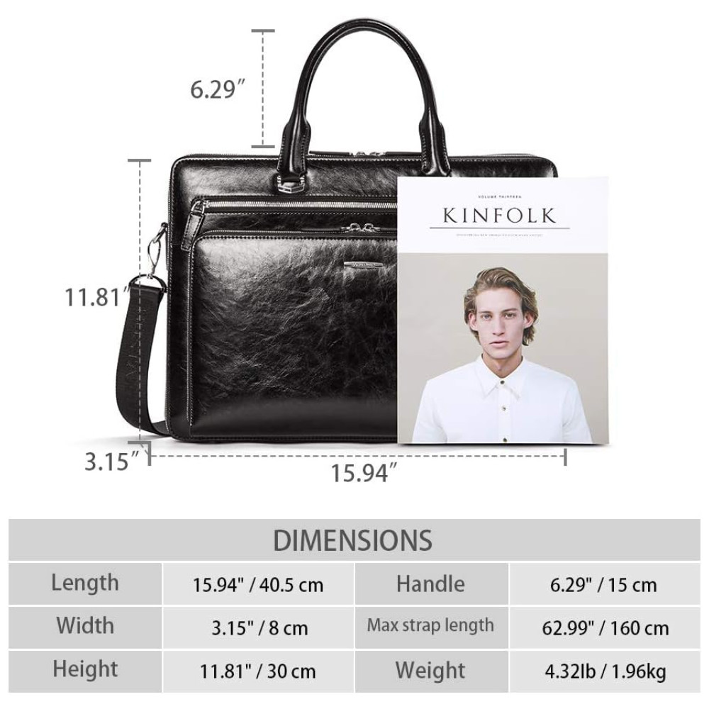 Material de alta qualidade A pasta é feita de couro de cera de óleo de couro de grão superior, durável e mais fino. Forro de tecido durável, com hardware de prata. Os zíperes são substanciais e duráveis. Alça de ombro acolchoada, removível e ajustável. Dimensões L 15,94 x W 3,15 x H 11,81 polegadas , L 40, x W x H . Queda do punho é de , 6,29 polegadas. o comprimento da correia é de cerca de 62,99 , O peso líquido é de cerca de 4,32 lb , 1,96 kg. Estrutura Compartimento duplo com zíper 1 bolso acolchoado para laptop 1 bolso com zíper 9 bolsos deslizantes 3 slots para canetas 16 slots para cartão 1 bolso com zíper traseiro 1 bolso com zíper frontal. Organizador de bolso da frente detém uma variedade de essenciais de negócios, incluindo um telefone celular. O compartimento superior com zíper permite acesso fácil e rápido à seção principal com divisor de arquivos. Secure Stylish Mantenha o seu computador portátil bem protegido e os seus outros itens de negócios do dia a dia elegantemente organizados nesta pasta. Pode ser como pasta de advogados, bolsa para laptop ou maleta funcional para transporte manual. O design clássico é perfeito para homens de negócios