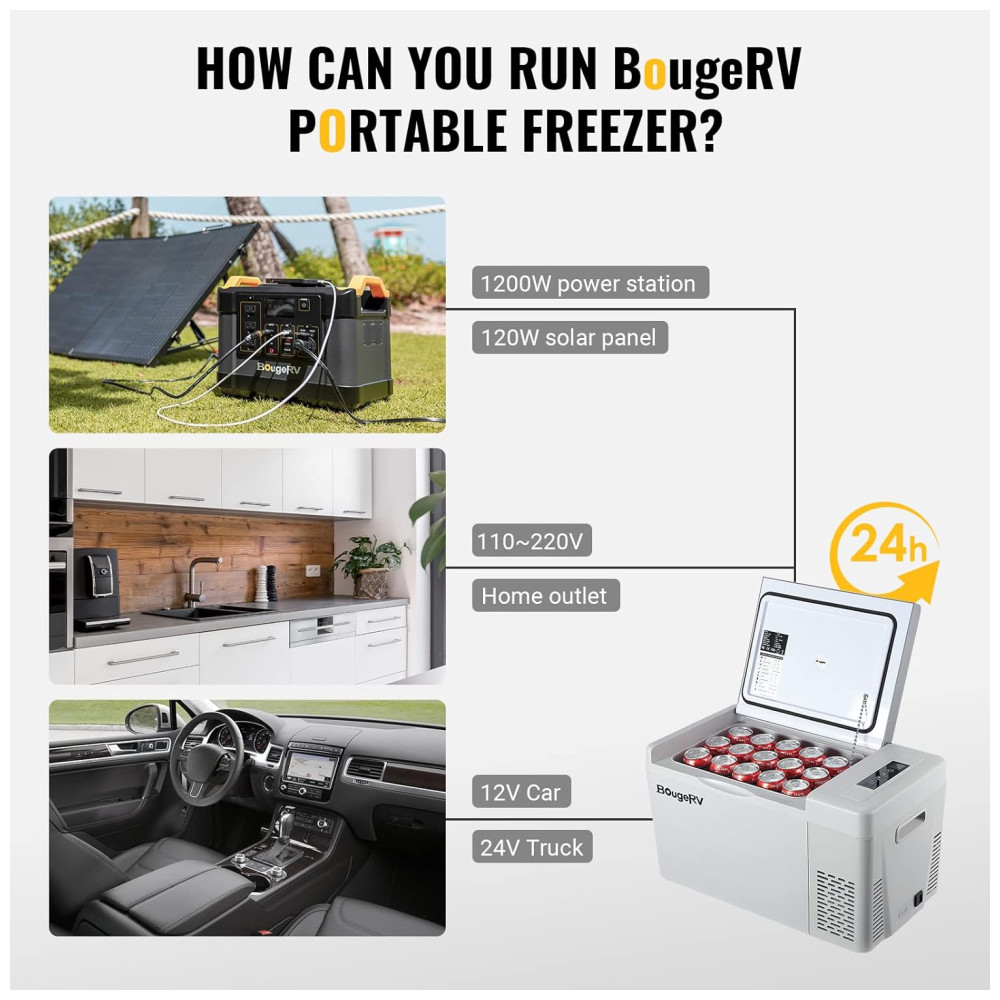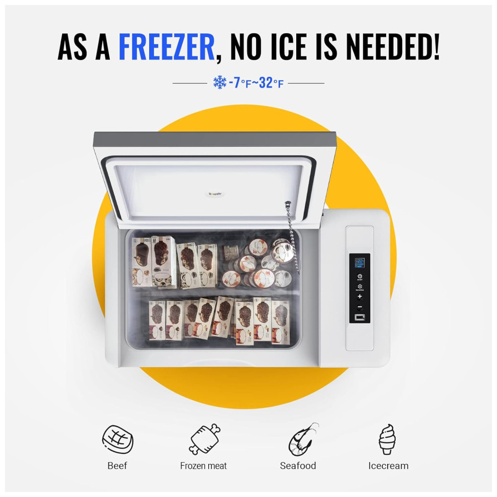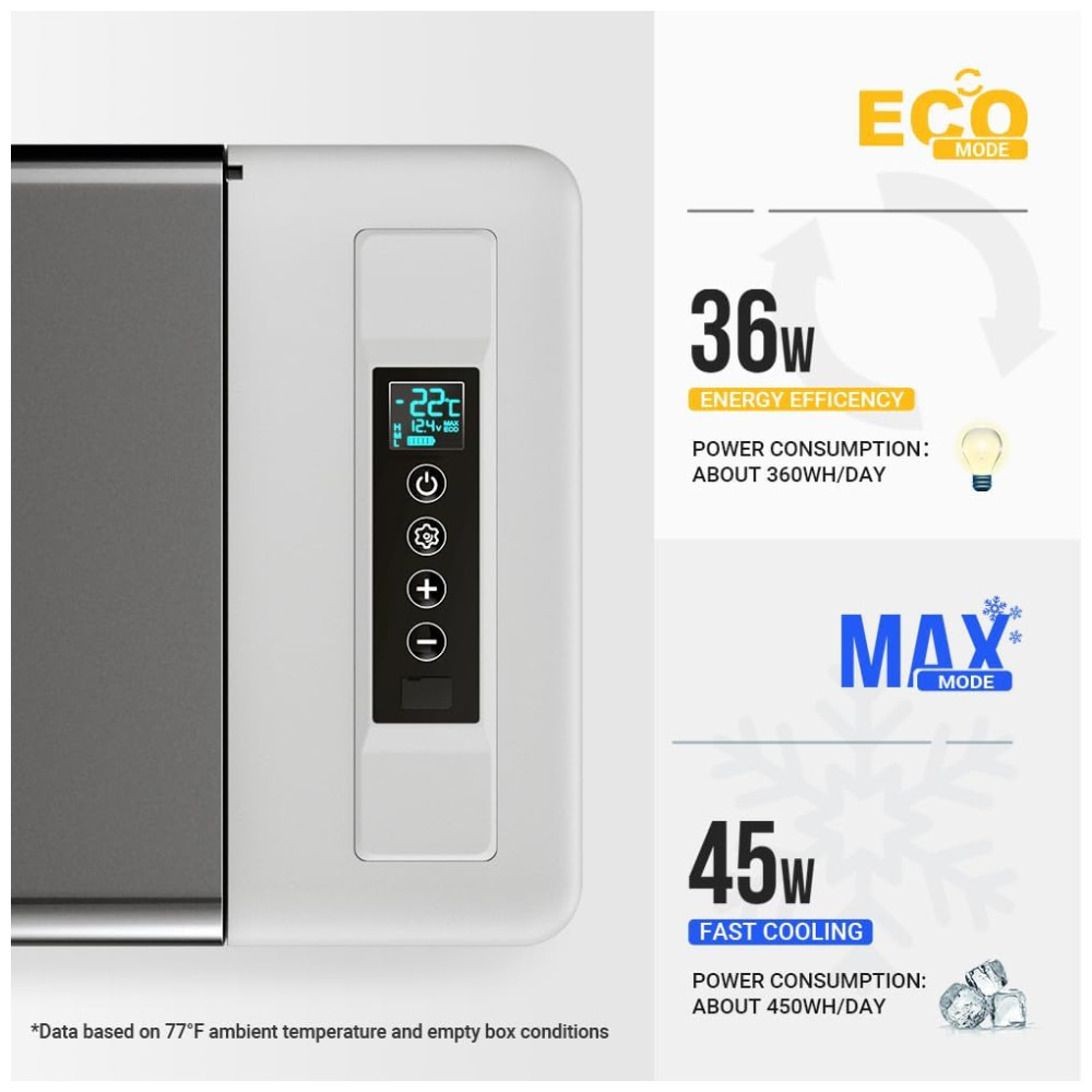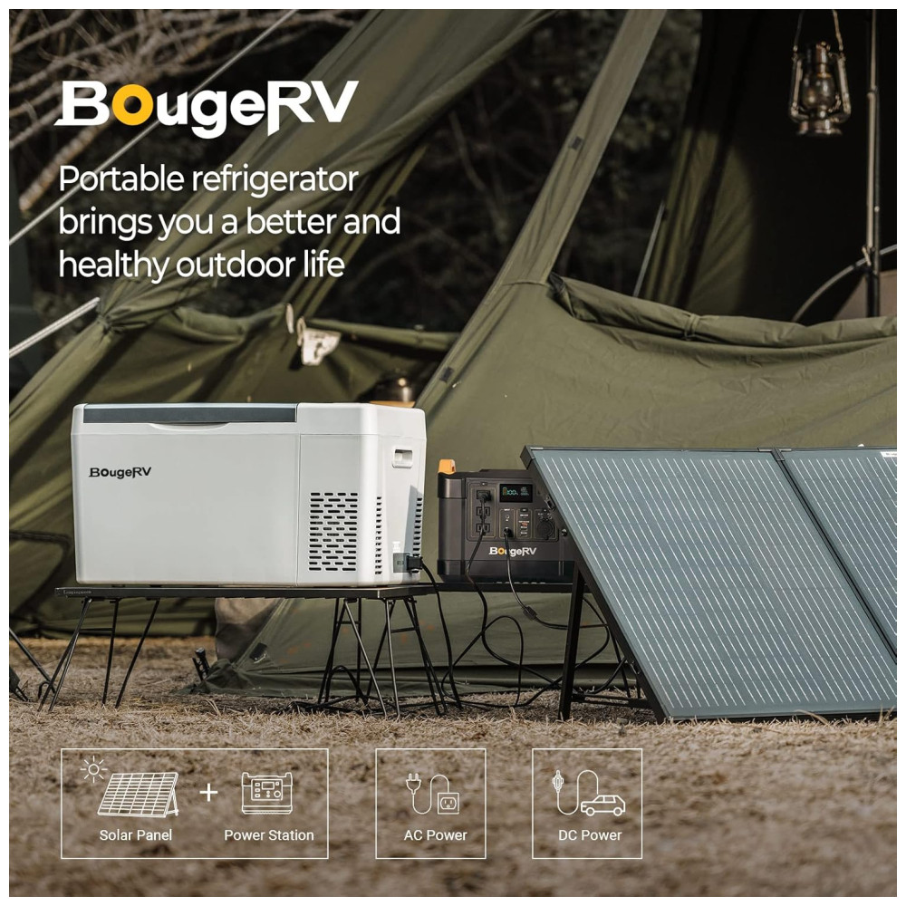 Garantia pelos seus direitos O refrigerador CR22 12V vem com garantia de 2 anos. Se você tiver alguma dúvida sobre o produto, ENTRE EM CONTATO COM A BougeRV antes de devolvê lo, pois oferecemos serviço pós venda sem complicações. Pacote incluído Capa isolada para refrigerador 23QT, refrigerador 23QT, cabo de alimentação CC, cabo de alimentação CA e manual do usuário. Resfriamento rápido para 32 Com a tecnologia de refrigeração do Compressor, este refrigerador de carro de 12 V pode atingir 20 min de resfriamento rápido de 77 a 32 e 50 min de 77 a 5, mantendo sua comida fresca. Sem necessidade de gelo, sem comida estragada, economia de dinheiro e espaço. Baixo consumo de energia de 36 W Com o modo de economia de energia ECO, a potência operacional deste refrigerador portátil de 30 Qt é inferior a 36 W. Mesmo rodando no modo MAX, consome bem menos de 1kwh por dia para seu trabalho de ciclo inteligente. Você pode operar este freezer portátil com alimentação de 12 24 V CC em vários veículos, como SUVs, caminhões, trailers, trailers, vans, barcos etc. tenha uma boa noite de sono depois de uma longa condução. Este refrigerador de camping também possui um design à prova de choque para enfrentar a estrada irregular, operando sem problemas em caso de inclinação de 30 quando você estiver fora da estrada. Proteção da bateria com 3 níveis de tensão O refrigerador RV está equipado com um monitor de bateria de 3 níveis para evitar que o refrigerador descarregue a bateria do seu veículo. Você pode escolher em que voltagem da bateria o refrigerador desliga para evitar o esgotamento total da bateria
