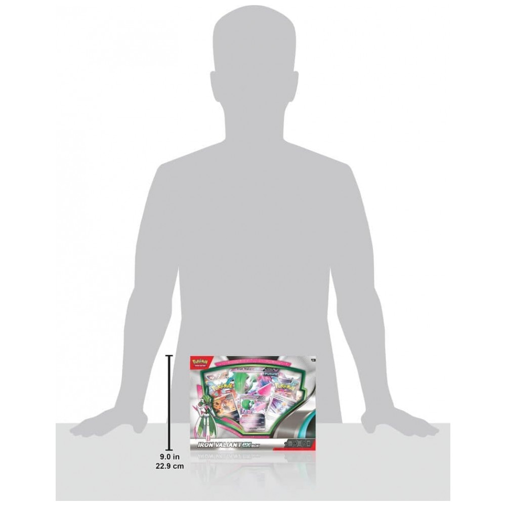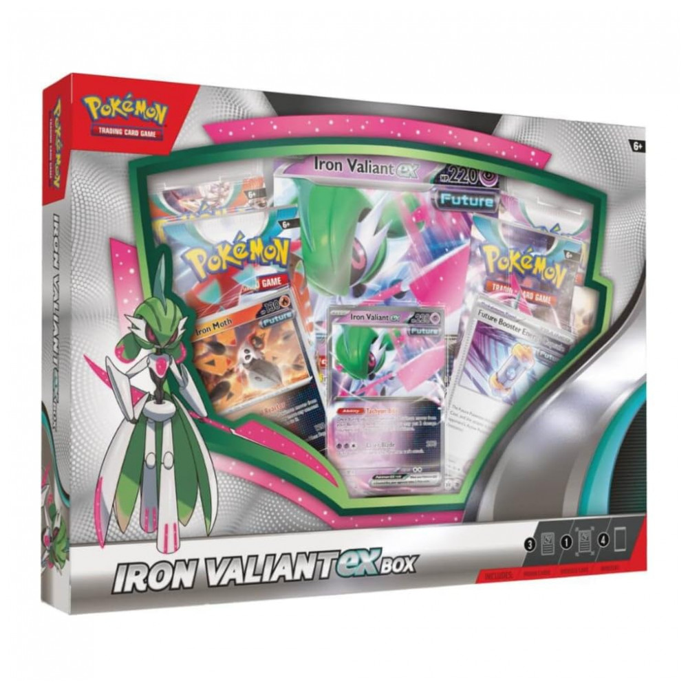 A box Pokémon TCG Roaring Moon ou Iron Valiant ex é um produto selado de cartas colecionáveis em que o cliente recebe aleatoriamente uma das duas versões: Roaring Moon ex Box ou Iron Valiant ex Box. Cada versão inclui uma carta promocional holográfica em destaque e uma carta holográfica em formato gigante da mesma criatura, adequada para exposição em coleção.