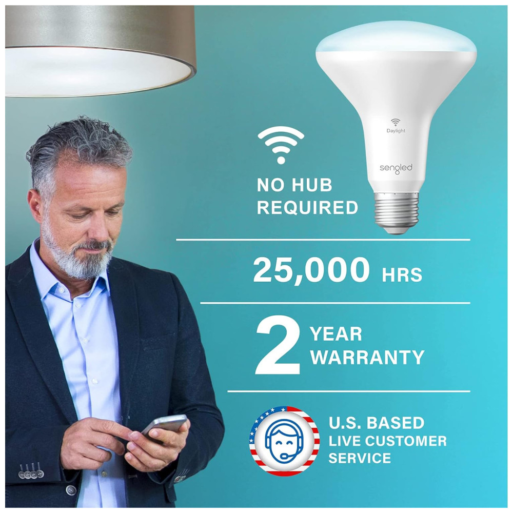 Nenhum hub ou hardware extra é necessário. As lâmpadas inteligentes podem se conectar facilmente à rede WiFi de 2,4 GHz da sua casa. Lâmpada LED BR30, o primeiro passo para iniciar uma casa totalmente inteligente. Nota 5 GHz não é suportado.