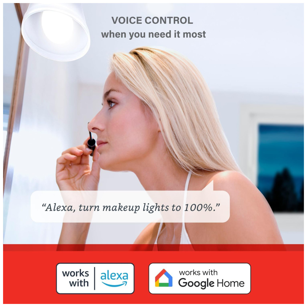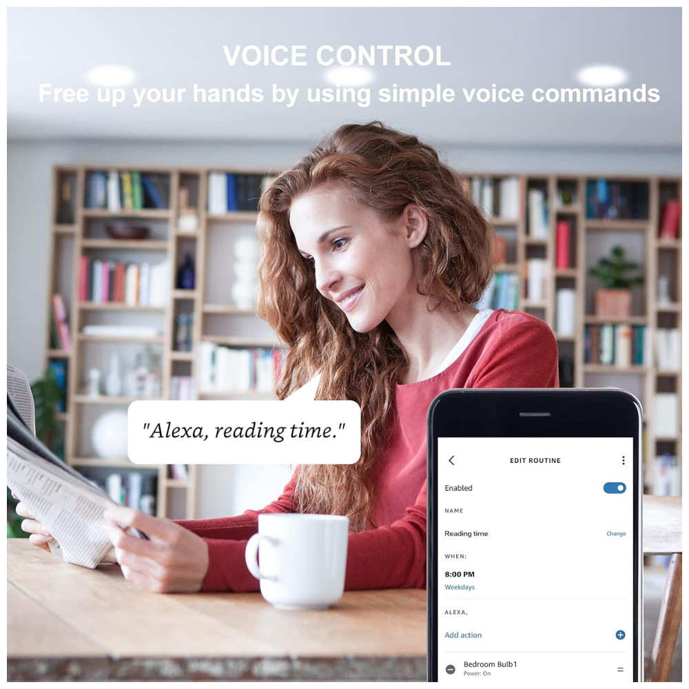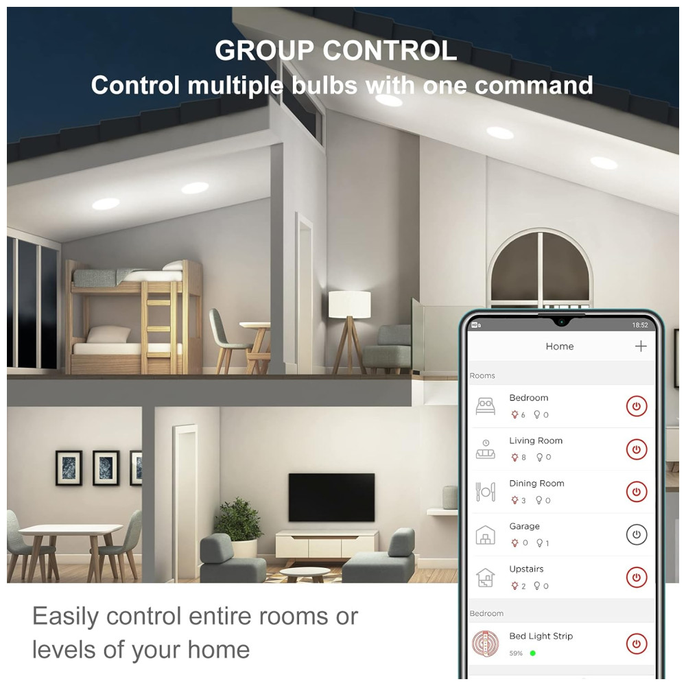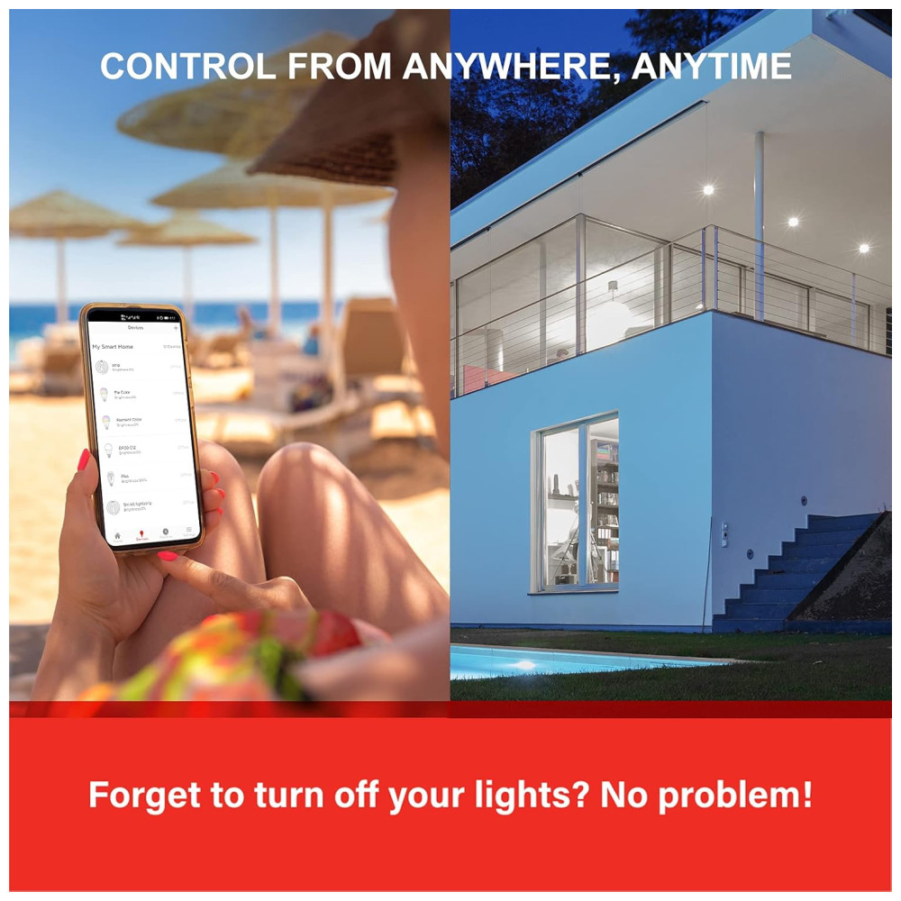 Controle por aplicativo Controle sua iluminação de qualquer lugar. Use dispositivos alexa ou o Google Home para controlar facilmente sua lâmpada inteligente alexa. Mesmo se você estiver viajando, você pode controlar remotamente as lâmpadas de inundação led embutidas da sua casa diretamente do seu aplicativo móvel.