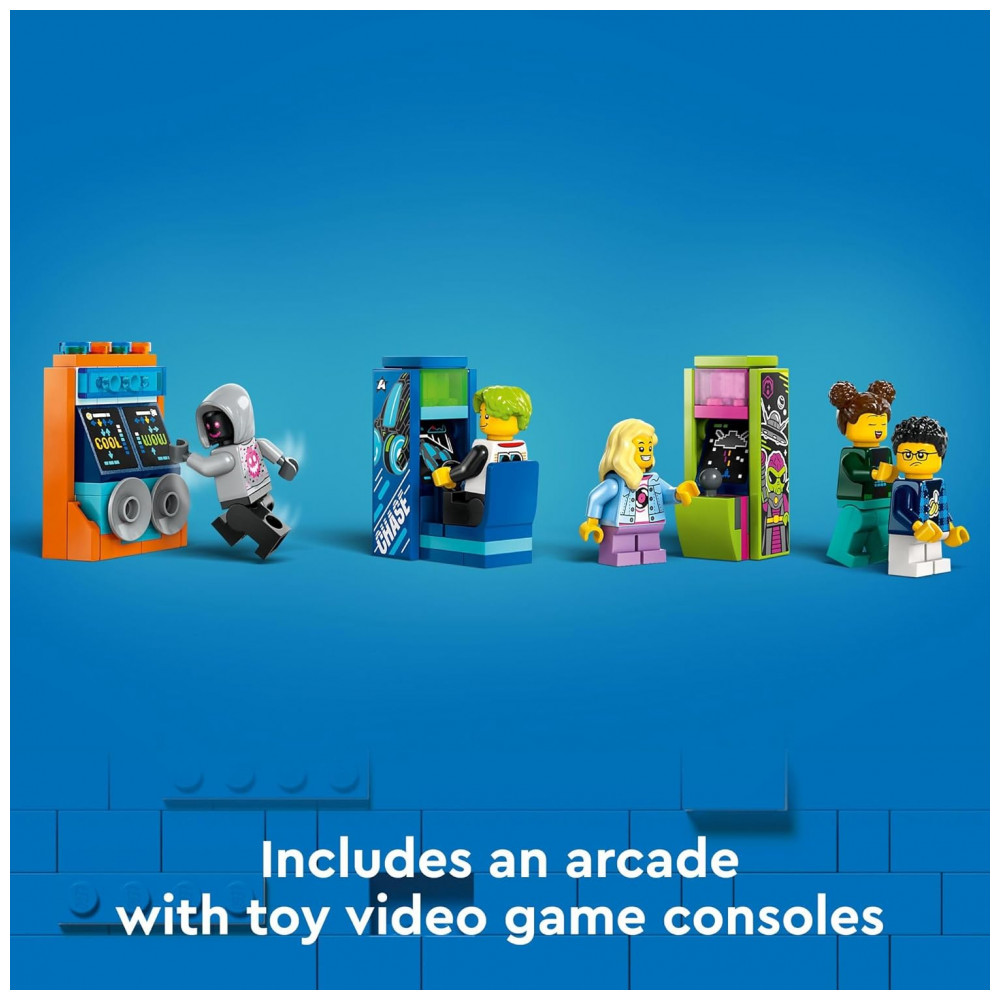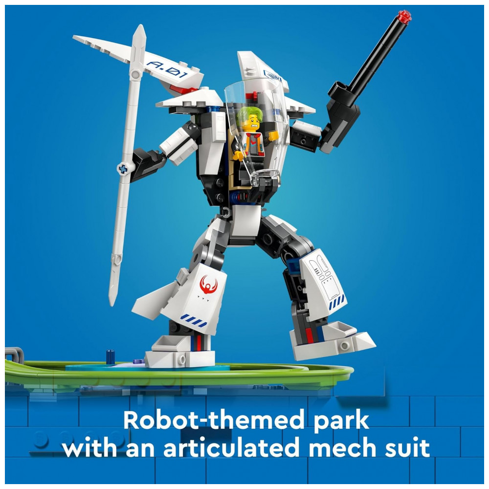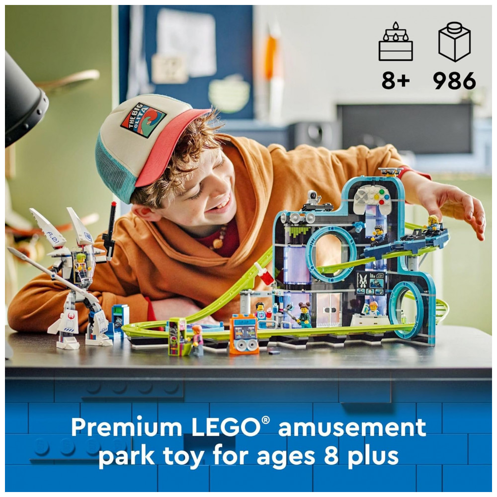 A montanha-russa utiliza um circuito elevado com subidas e curvas, onde o trem de três vagões pode ser deslocado manualmente ao longo dos trilhos. O robô possui membros articulados e ponto de fixação para minifigura no cockpit, compondo cenas de apresentação ou exposição dentro do parque. As máquinas de arcade, consoles de videogame e acessórios de parque, como troféu, copos de bebida e celulares, ampliam as possibilidades de montagem de cenas e narrativas.