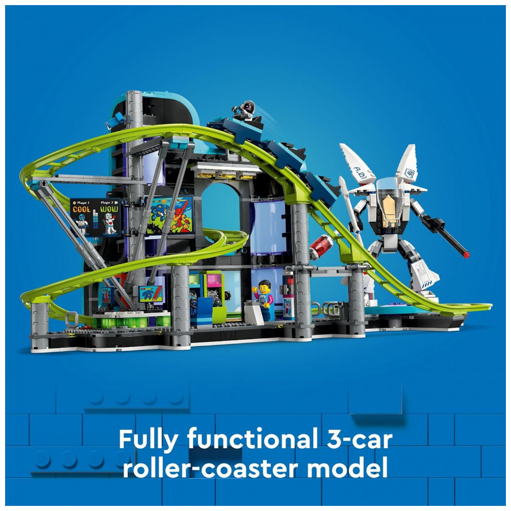 O conjunto LEGO City Robot World Roller Coaster Park 60421 traz uma montanha-russa temática de robôs com trilho funcional de três carrinhos, ambientada em um parque inspirado em jogos e arcade. O cenário inclui uma área de videogames com consoles, arena de e-sports, quiosque de bebidas estilo raspadinha e estruturas decoradas com elementos tecnológicos. O set vem com oito minifiguras e um robô articulado em que uma minifigura pode ser posicionada, permitindo diferentes situações de brincadeira.