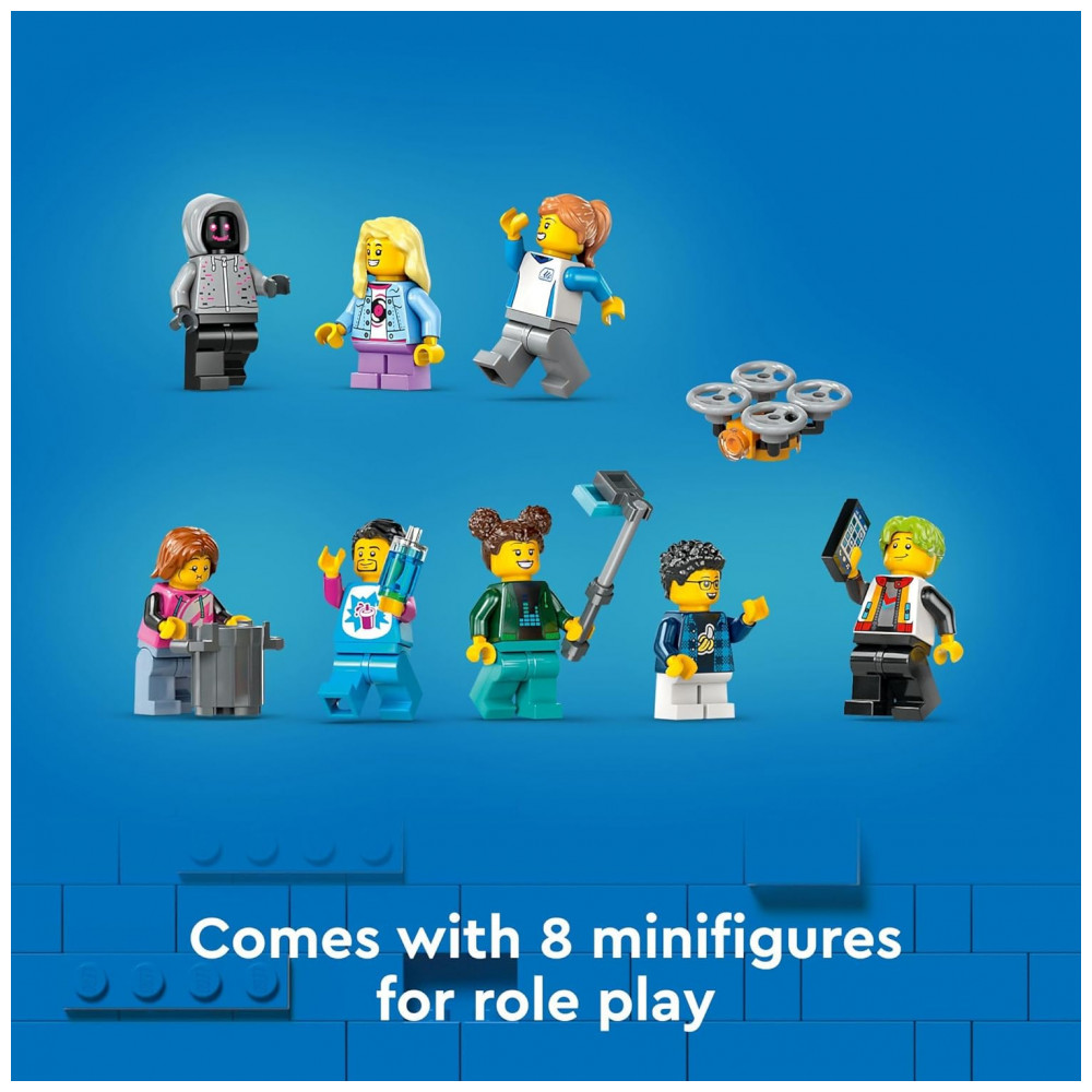 O conjunto é composto por 986 peças em plástico, recomendadas para crianças a partir de 8 anos, e acompanha instruções de montagem impressas e suporte digital no aplicativo LEGO Builder. As dimensões do modelo montado garantem presença de destaque em prateleiras ou mesas de exposição, com altura, largura e profundidade adequadas para integração com outros cenários LEGO City. O produto não utiliza baterias, mantendo o foco em montagem manual e operação mecânica simples.