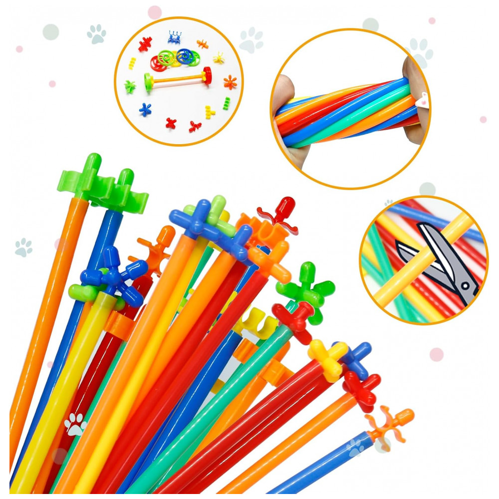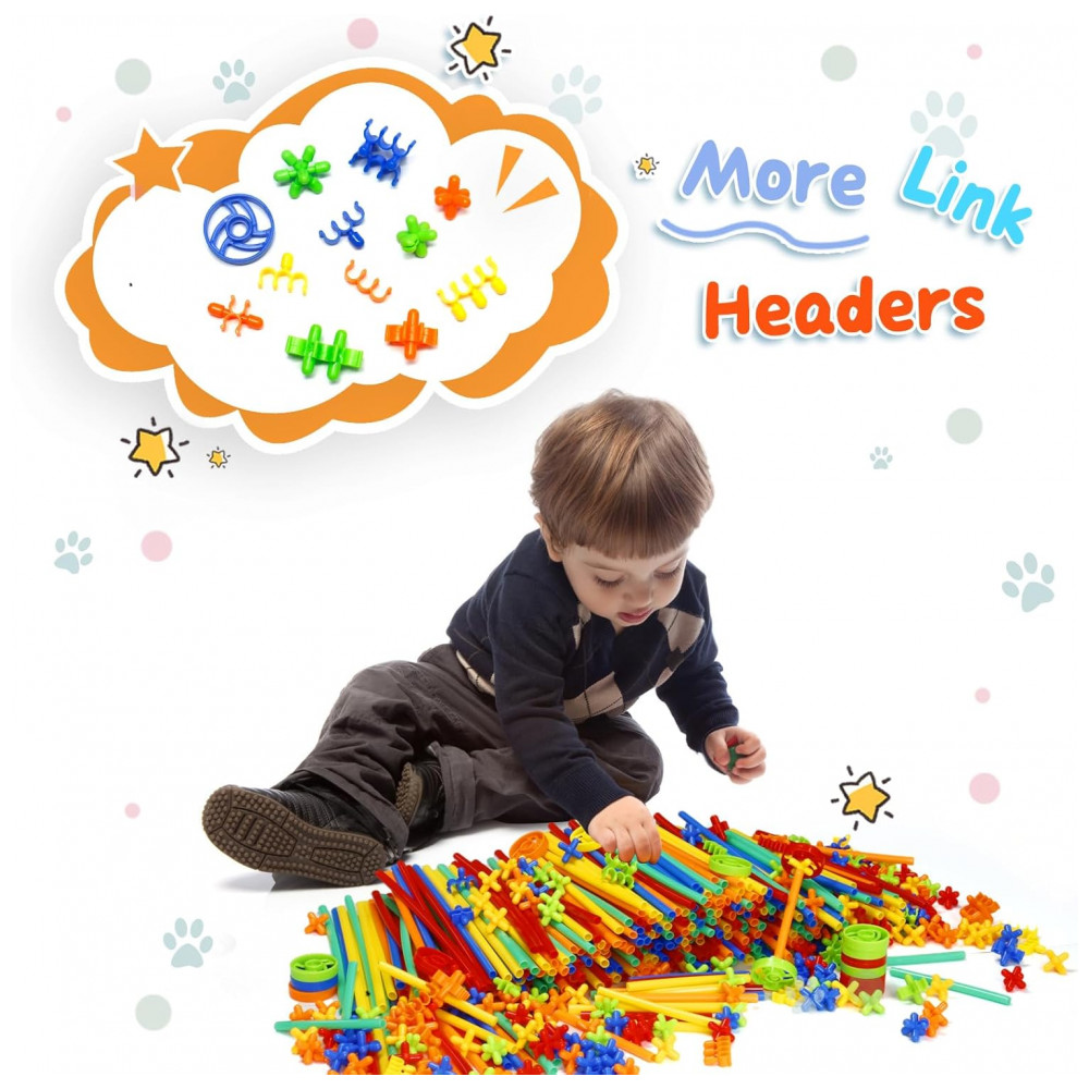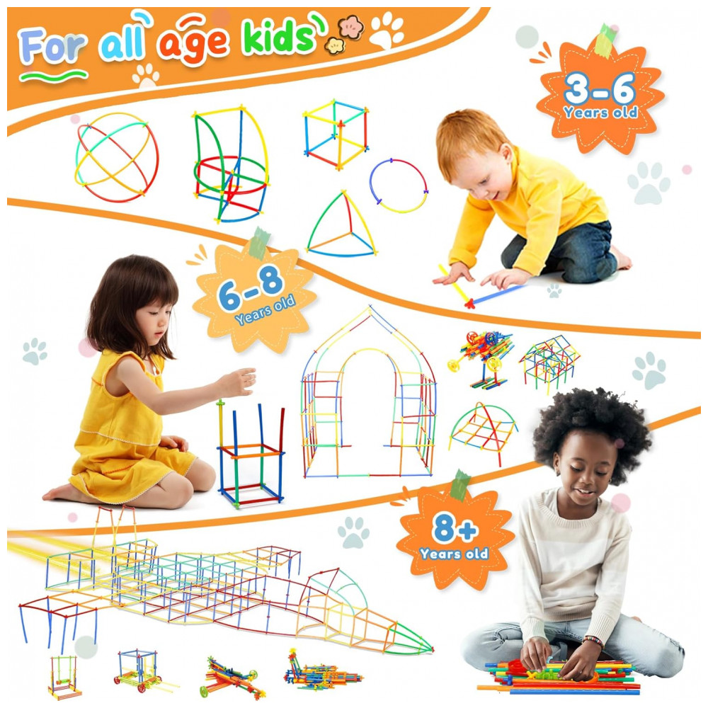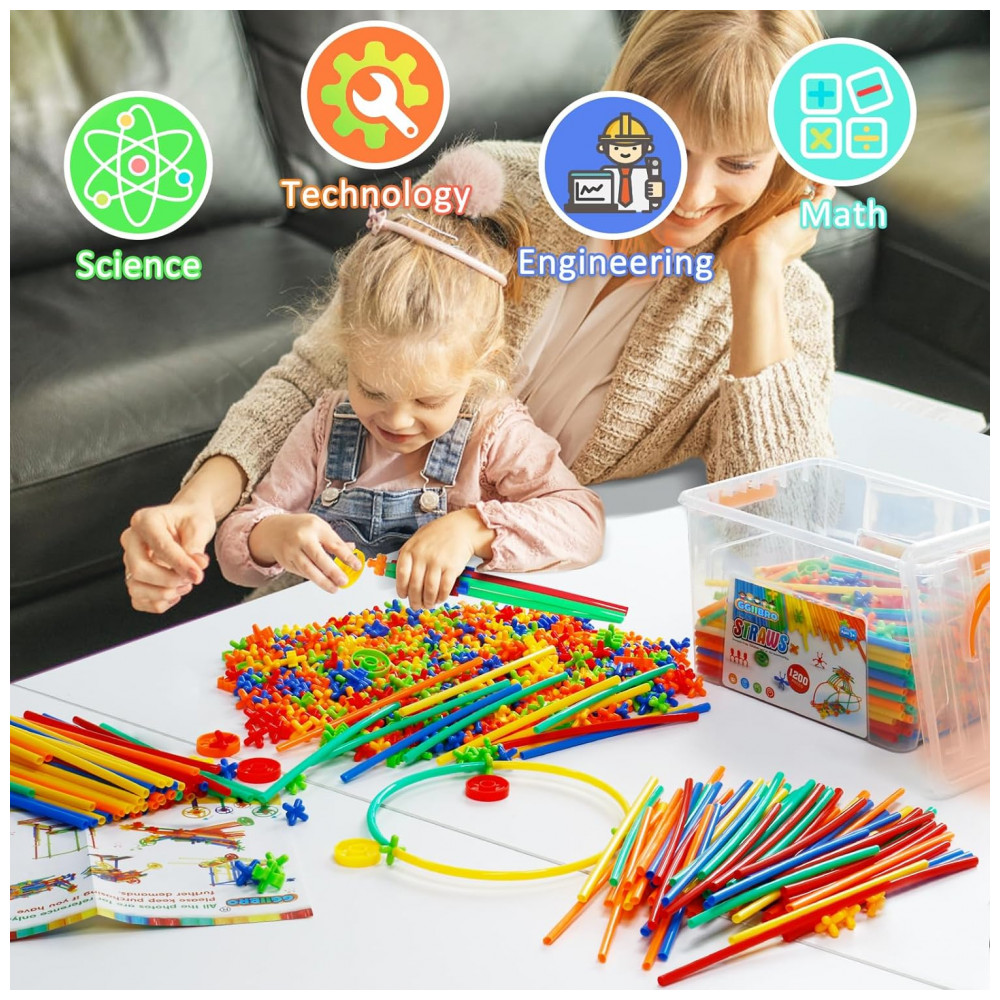 Os canudos coloridos são combinados com conectores que permitem junções em múltiplos ângulos, possibilitando construções abertas, túneis e estruturas volumétricas maiores. O total de 1200 peças oferece quantidade suficiente para que várias crianças utilizem o kit ao mesmo tempo, favorecendo projetos colaborativos e exercícios de trabalho em equipe. As peças suportam múltiplos ciclos de montagem e desmontagem, incentivando experimentação com diferentes combinações e formatos.