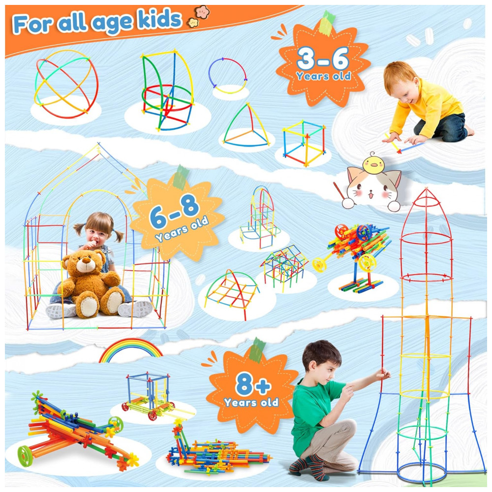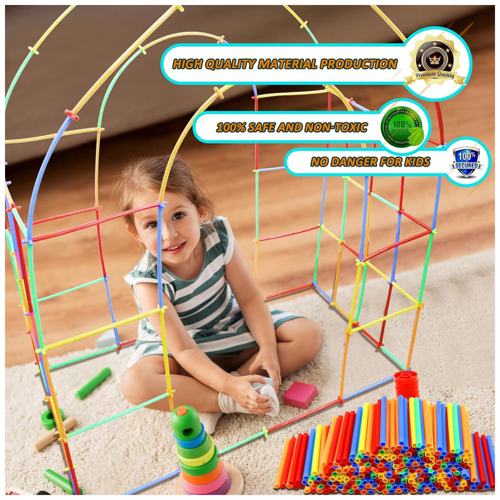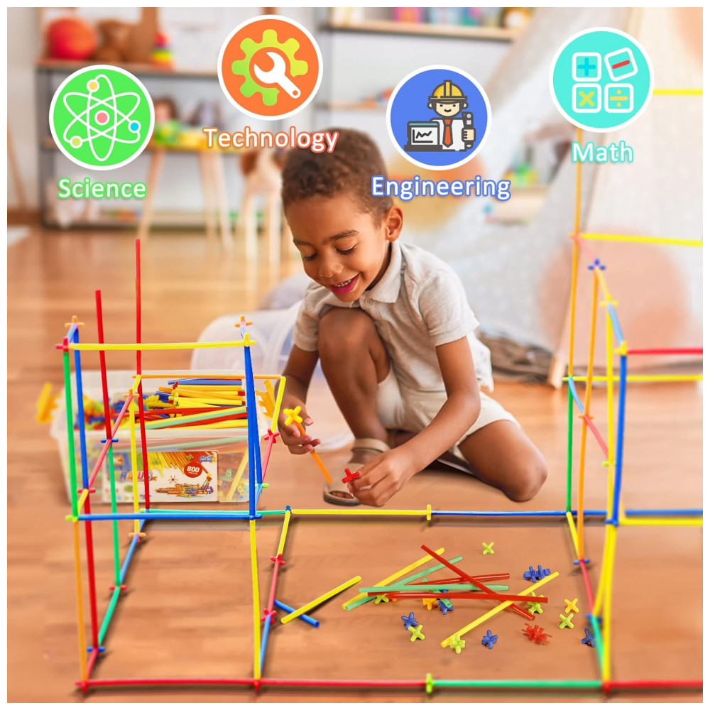 Os canudos coloridos se conectam por peças de junção em múltiplos ângulos, permitindo construções abertas, túneis e volumes maiores. A quantidade de 800 peças favorece o uso simultâneo por várias crianças, tornando o kit adequado para projetos colaborativos e dinâmicas de trabalho em equipe. As peças permitem montagem e desmontagem repetidas, apoiando a experimentação com diferentes combinações e formatos.