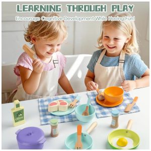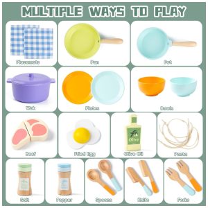 Conjunto de Cozinha de Brinquedo para Crianças de 4 a 8 Anos: Inclui componentes realistas como macarrão, carne, ovos fritos, azeite, pimenta, sal, além de panelas, wok e acessórios (garfo, colher, faca, pratos, tigelas). Promove desenvolvimento motor fino, criatividade e coordenação através de cenários de culinária imaginativa.