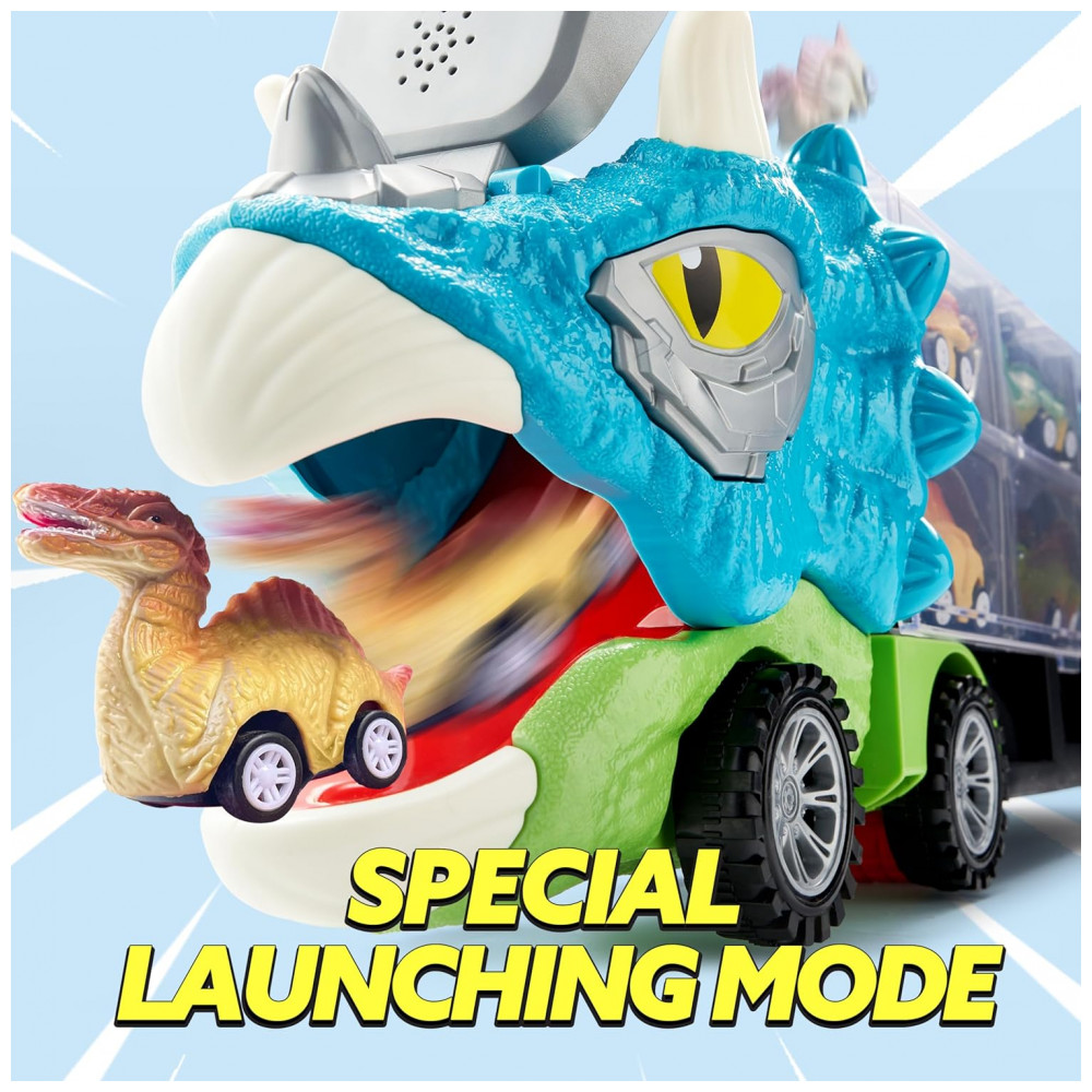 O Caminhão Transportador com Dinossauros Grandes da JOYIN é um conjunto impressionante com 13 peças, incluindo 1 grande caminhão transportador de dinossauros com botão sonoro e luzes, 8 mini carros de dinossauros de tração, 3 veículos de dinossauros mini die-cast e 1 helicóptero. Este caminhão realista de dinossauros emite 7 sons simulados, desde a partida do motor até rugidos de dinossauro, proporcionando uma experiência incrível. A cabeça articulada do caminhão permite que os 12 veículos deslizem facilmente, incentivando a coordenação motora e a aprendizagem temática de dinossauros. Seguro, confiável e aprovado pela ASTMF963, este brinquedo é feito de plástico de alta qualidade e resistente a colisões, com designs realistas e detalhados.