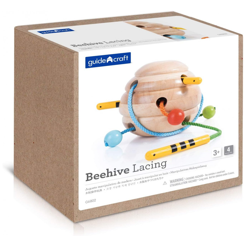 O Guidecraft Beehive Lacing é um brinquedo de enfiar em madeira inspirado em uma colmeia, indicado para crianças de 3 a 10 anos praticarem coordenação motora fina, sequências simples e coordenação olho-mão. O conjunto é composto por um bloco de colmeia em madeira com múltiplos furos passantes e três abelhas em cordões coloridos com ponteiras, que podem ser enfiadas em diferentes trajetos pelo bloco.