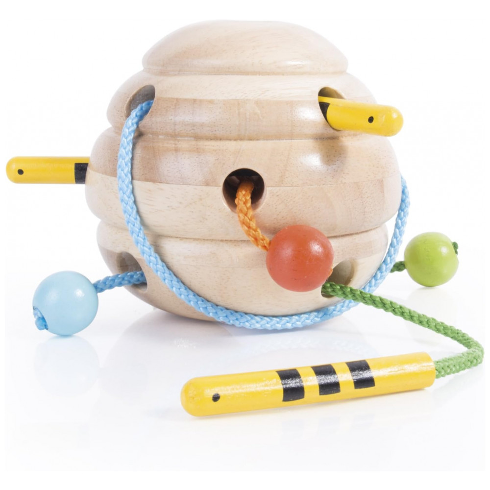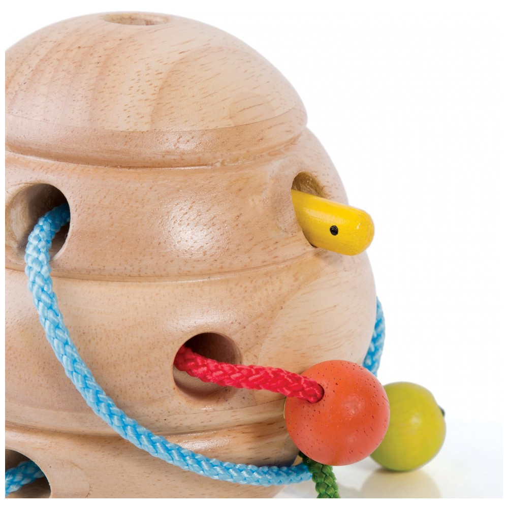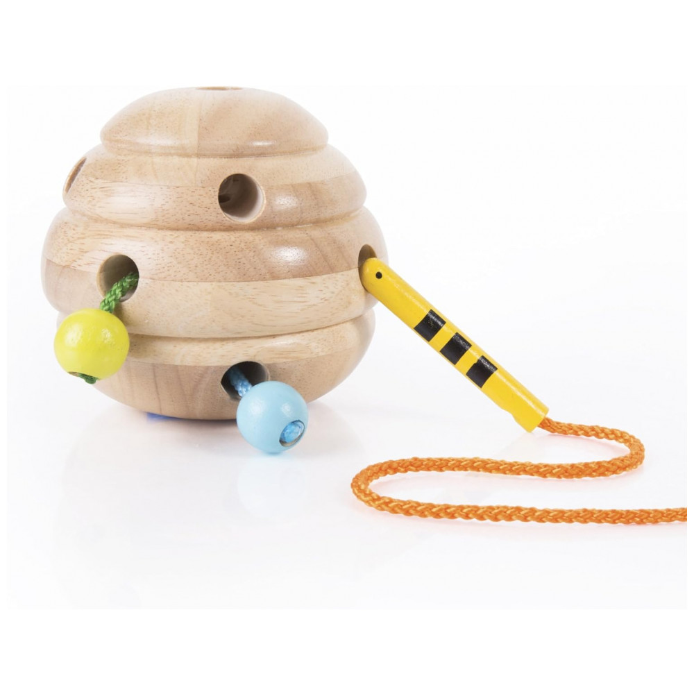 Brinquedo de encaixar Guidecraft Beehive Lacing em madeira com colmeia e 3 abelhas em cordões coloridos