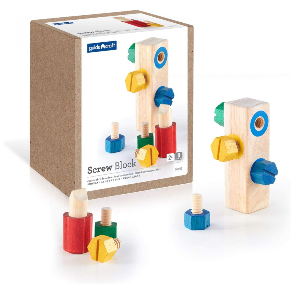 O Guidecraft Screw Block é um brinquedo de manipulação em madeira desenvolvido para crianças a partir de 2 anos, focado no treino de coordenação motora fina, força de pinça e coordenação olho-mão. O bloco de madeira possui aberturas que recebem parafusos coloridos, permitindo que a criança rosqueie e desrosqueie as peças utilizando a chave de fenda inclusa.