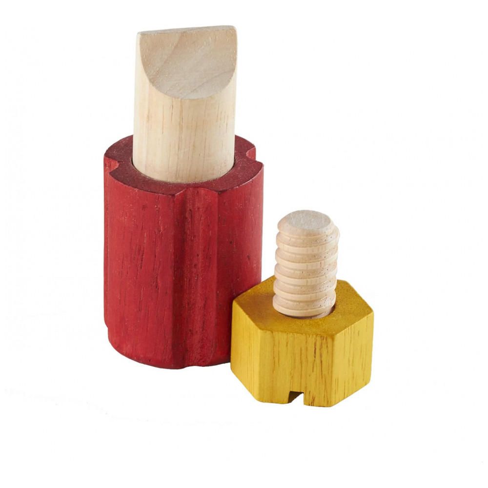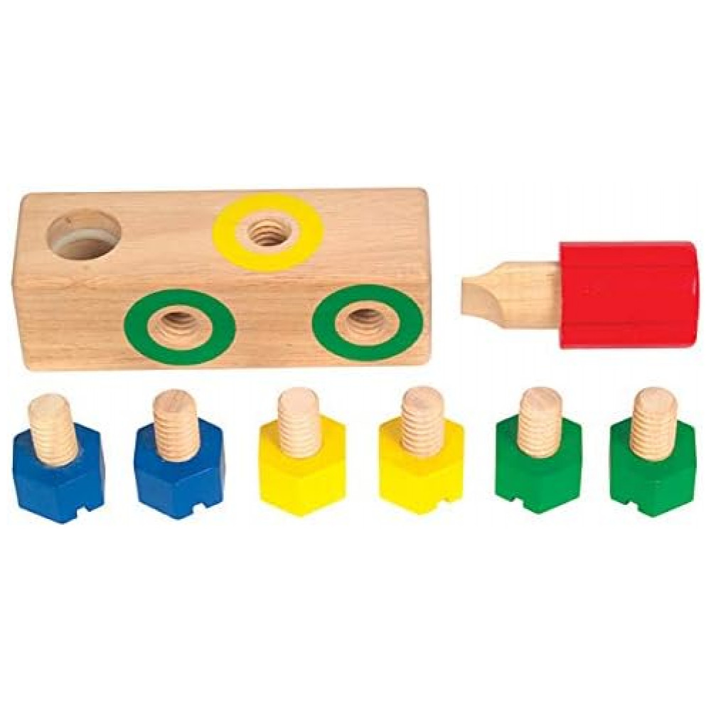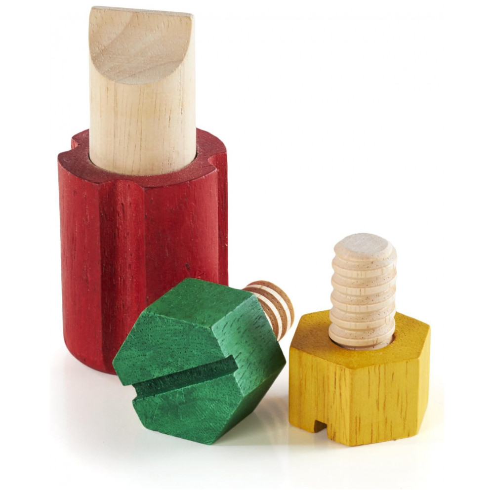 O conjunto é fabricado em madeira de seringueira (rubberwood), com anel interno em nylon que ajuda a manter a chave de fenda firmemente encaixada na base quando não está em uso. As cores variadas dos parafusos favorecem atividades de associação e pareamento, enquanto o formato compacto do bloco é adequado para uso em casa, escolas de educação infantil e espaços terapêuticos.
