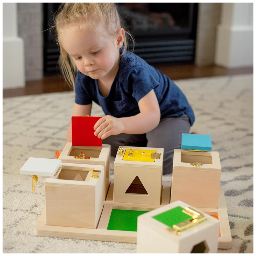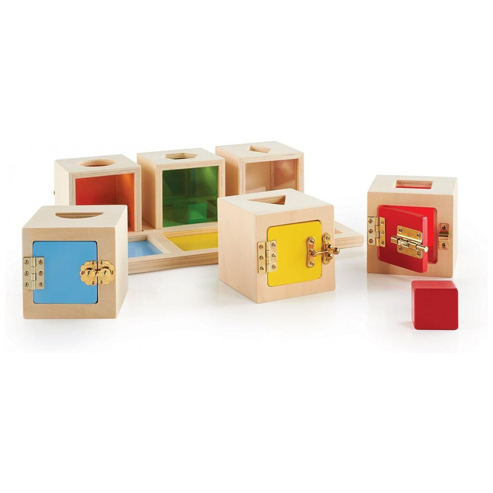 O Guidecraft Peekaboo Lock Boxes é um conjunto de seis caixas de madeira com fechaduras diferentes, desenvolvido para crianças a partir de 2 anos praticarem coordenação motora fina, solução de problemas e reconhecimento de formas. Cada caixa colorida possui um tipo de fecho único (trava, gancho, cadeado simples, entre outros), um recorte de forma geométrica na parte superior ou lateral e uma janela em acrílico colorido que permite visualizar o que está dentro.