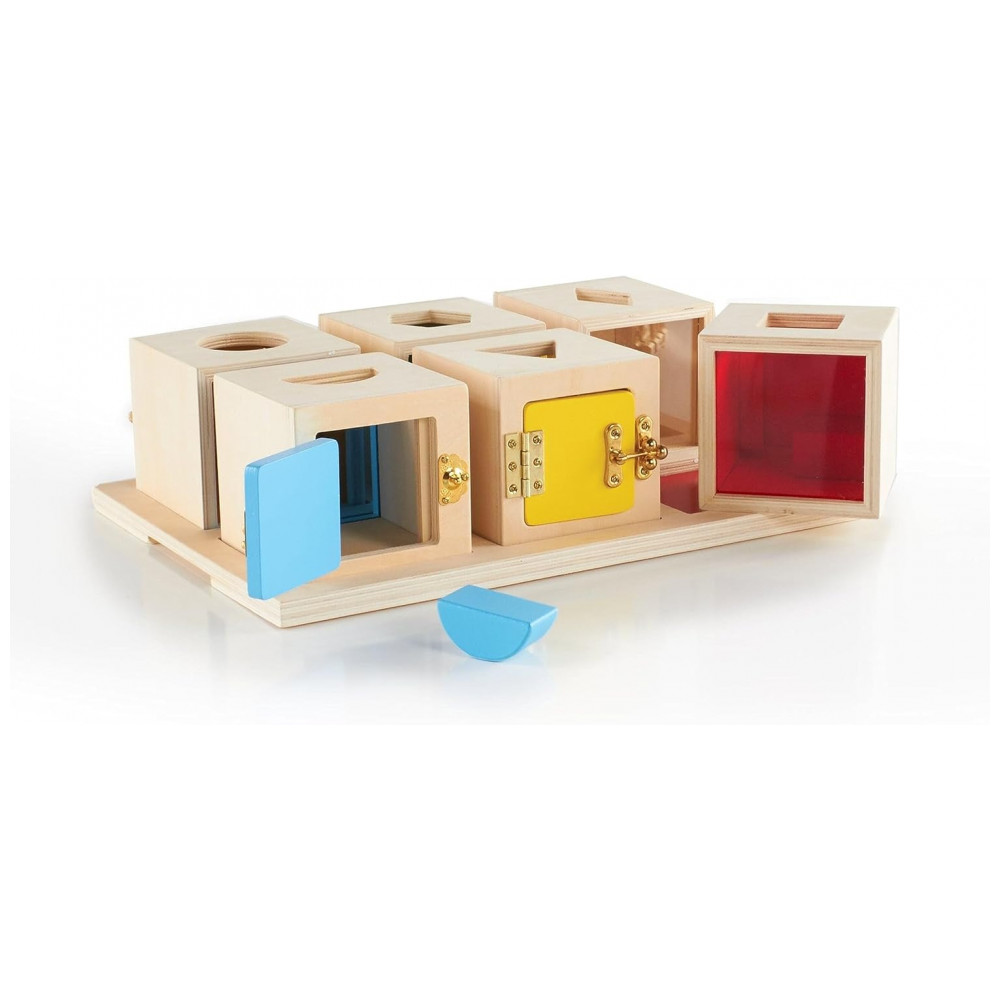 Brinquedo educativo Guidecraft Peekaboo Lock Boxes com 6 caixas com fechaduras e bandeja para atividades de encaixe e coordenação motora fina