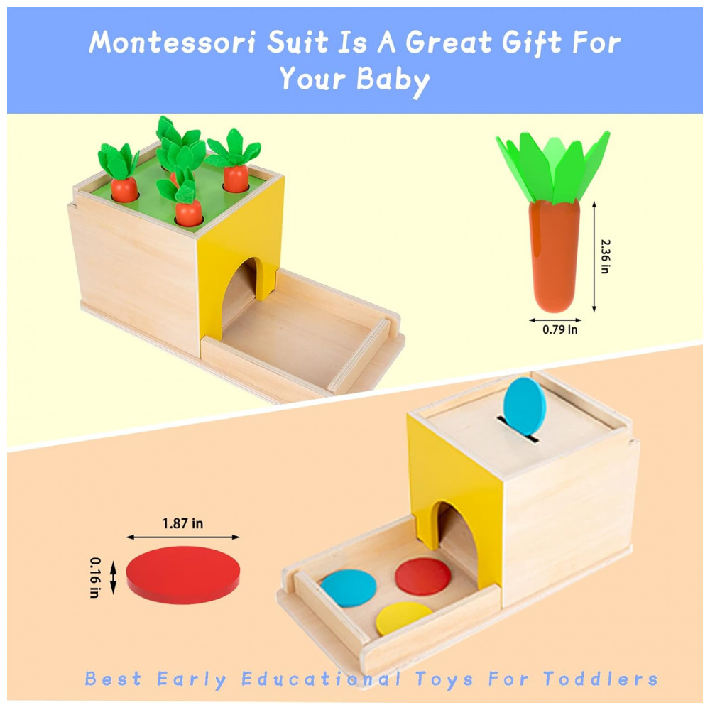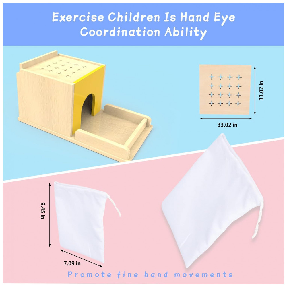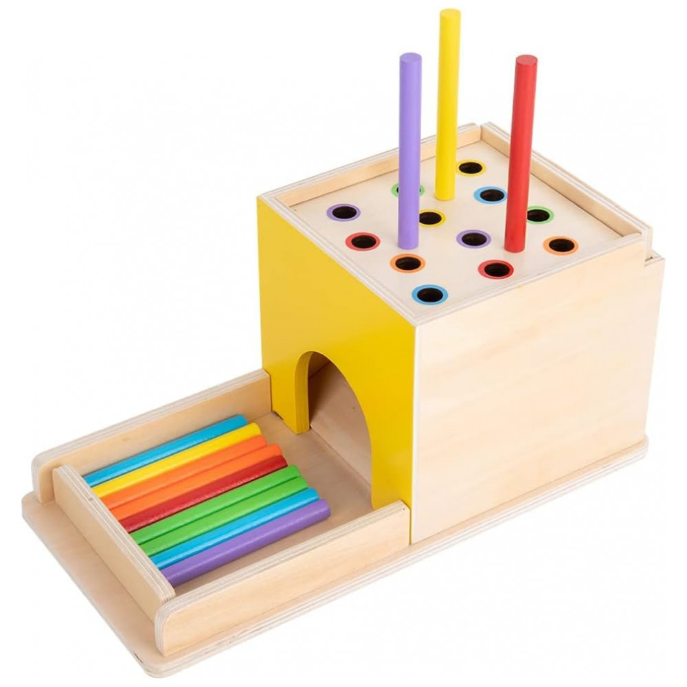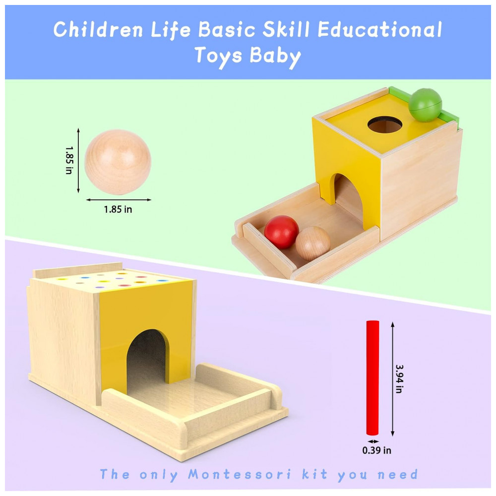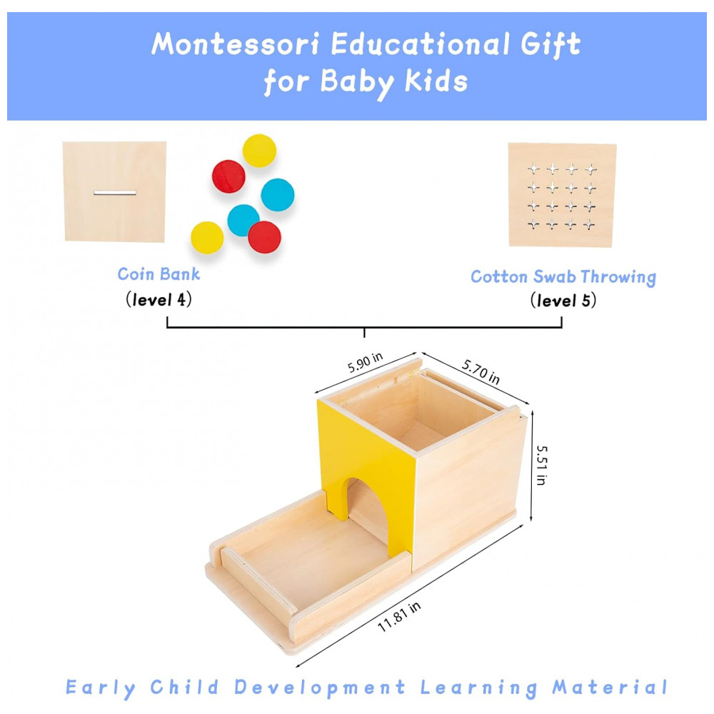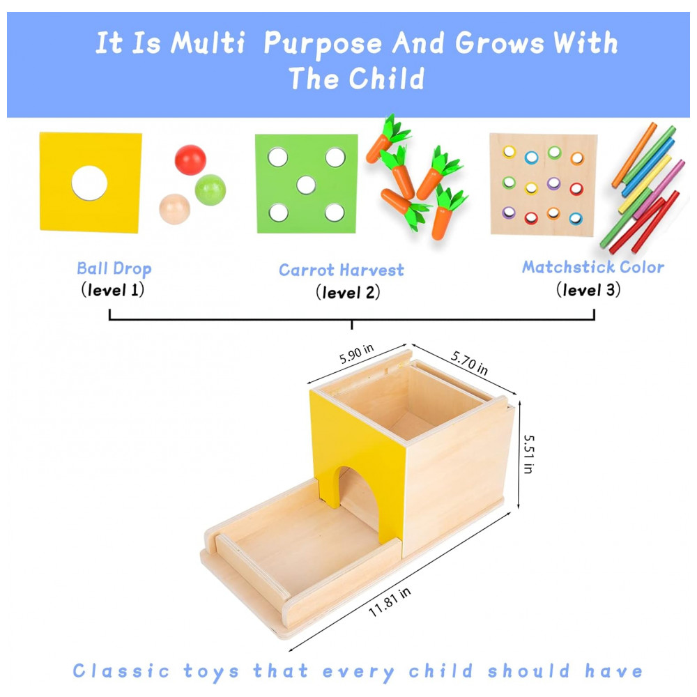 Este brinquedo educativo é introduzido às crianças quando atingem a capacidade de se sentar sem ajuda, começando com uma bola simples por volta de 8 12 meses. Com componentes como bolas de madeira, moedas, bastões de contagem, cenouras e cotonetes necessários, este brinquedo acompanha o desenvolvimento desde a infância até a pré escola, adaptando se aos diferentes estágios por meio da simples alteração da tampa superior da caixa