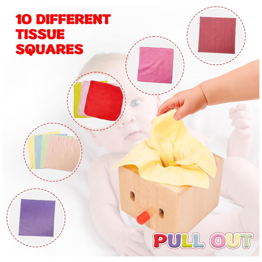 Este brinquedo inteligente projetado serve tanto como caixa de lenços quanto como fermenta educacional. Ele vem com dez tecidos quadrados meticulosamente desenhados, coloridos e texturizados. Esses tecidos não servem apenas ao seu propósito funcional, mas também envolvem os sentidos do bebê. Através da exploração tátil, seu filho pode descobrir diversas texturas e núcleos, tornado o aprendizado uma experiência desviada e prática.