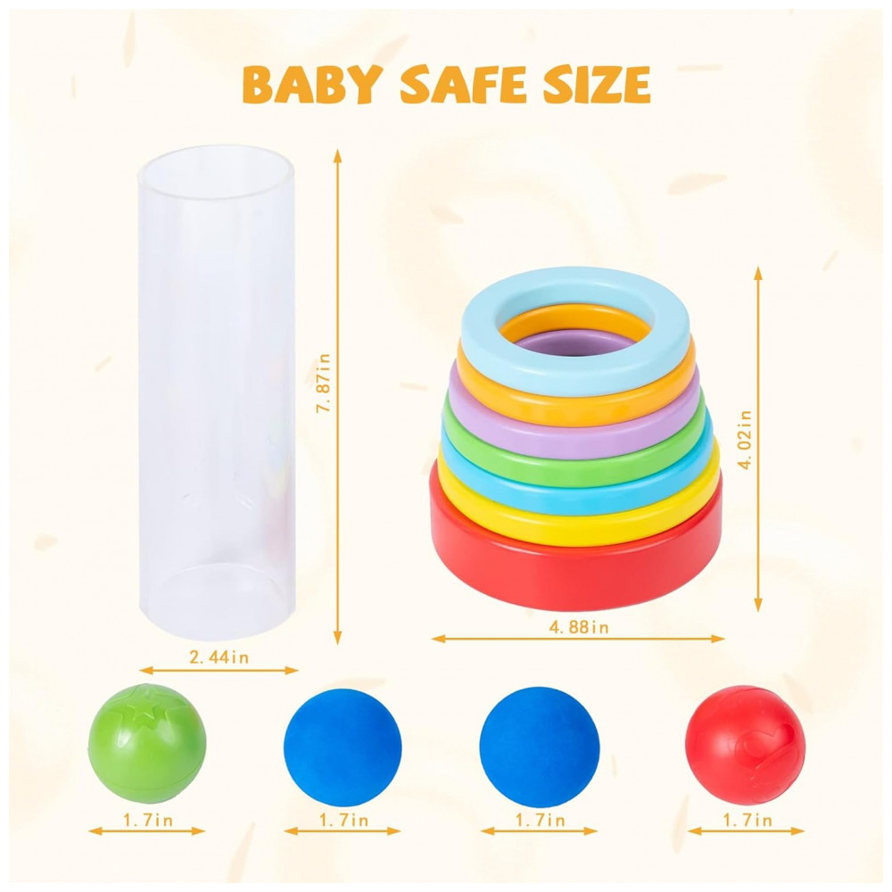 Fácil zenamento e portabilidade: O tubo transparente com anéis de empilhamento e bola de bebê foi projetado pensando na conveniência. Após a brincadeira, os anéis e as bolas podem ser facilmente zenados dentro do tubo transparente, facilitando a limpeza. Seu tamanho compacto também permite portabilidade sem esforço, tornando o um brinquedo ideal para brincar em qualquer lugar