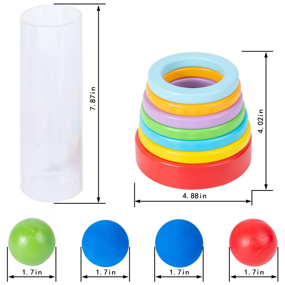 Diversão de empilhamento interativo: Apresente infinitas horas de brincadeira interativa com nosso tubo transparente com anéis de empilhamento e bola de bebê. Este brinquedo envolvente vem com sete anéis de empilhamento vibrantes em várias cores, um tubo transparente e quatro bolas duas de plástico e duas de EVA.