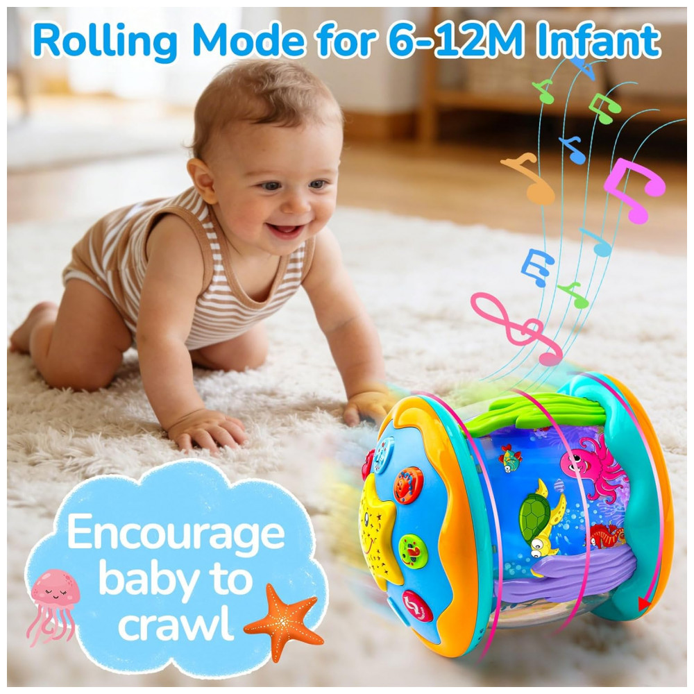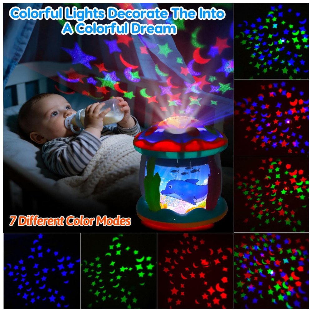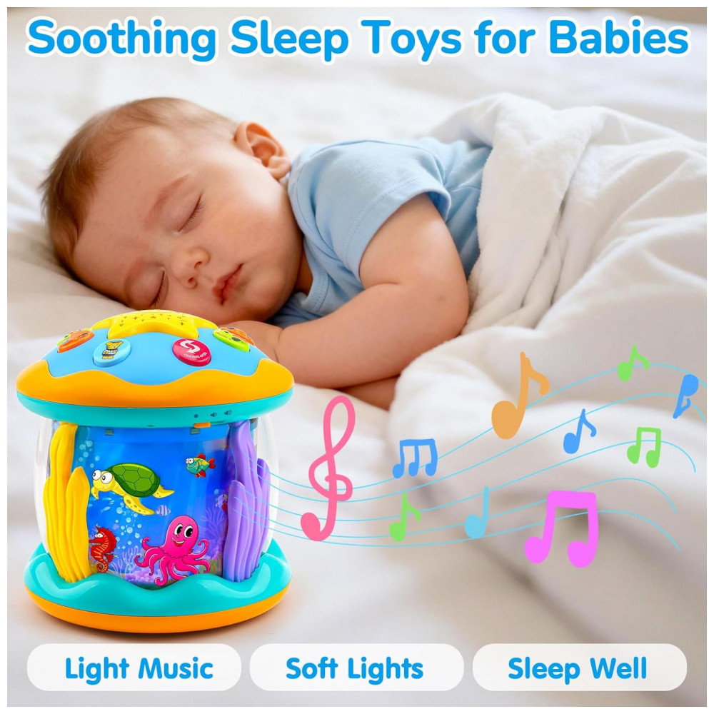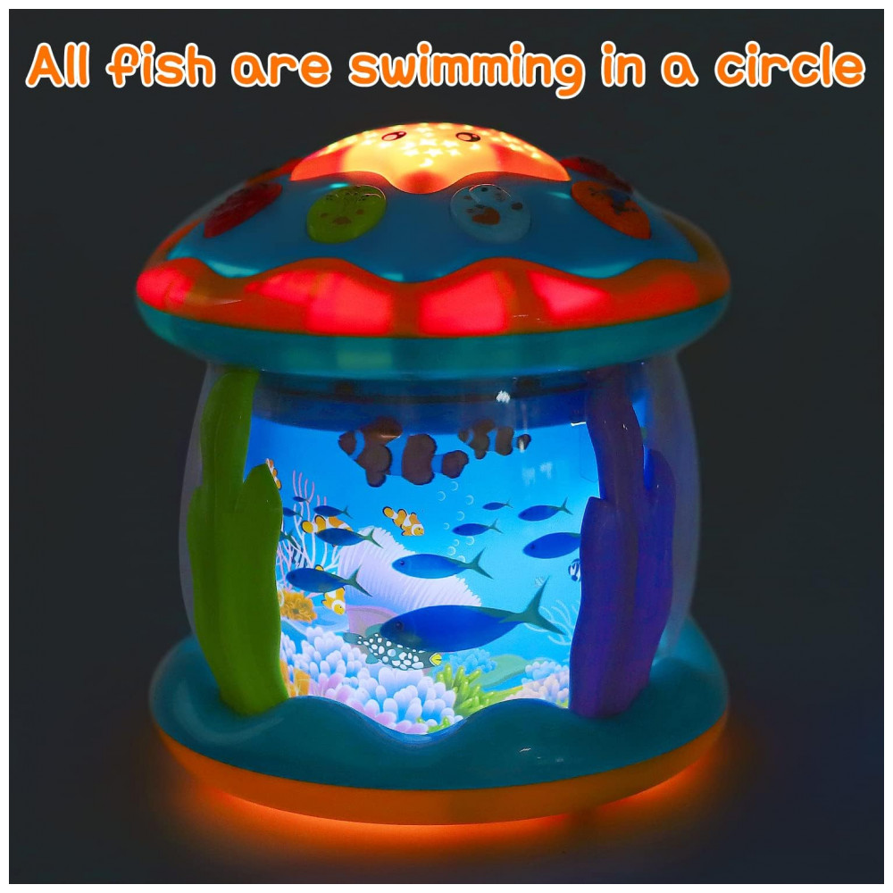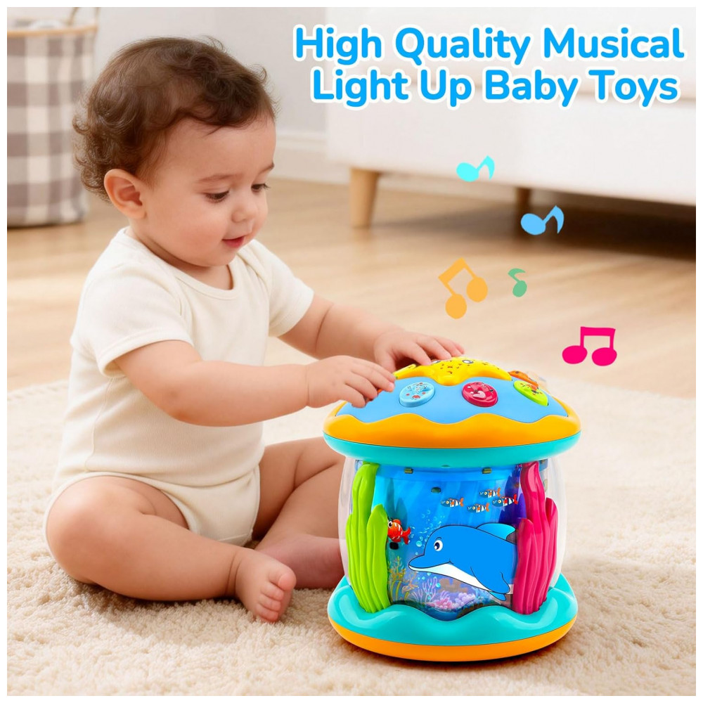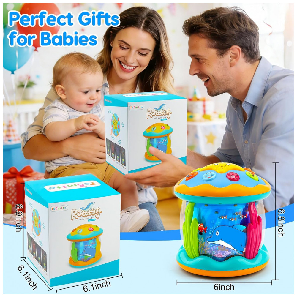 O brinquedo musical Ocean Projector Rotating Tsomtto é um projetor infantil com tema oceano que combina luzes, rotação de figuras e sons para estimular bebês durante o tummy time, engatinhar e os primeiros passos. A estrutura simula um pequeno aquário com animais marinhos que giram em 360°, acompanhados por iluminação azul e colorida, criando um efeito visual de mundo subaquático adequado para uso em ambientes internos.