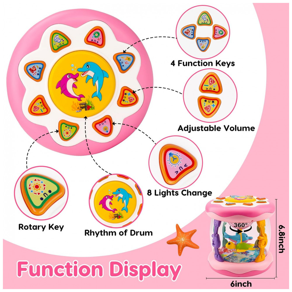 O projetor oceano giratório Tsomtto é um brinquedo infantil multifuncional com tema marinho, que combina projeção de luz, rotação de figuras, efeitos sonoros e músicas em um único módulo para uso desde a fase de colo até a etapa de engatinhar e caminhar. A estrutura simula um pequeno aquário, com golfinho e tartaruga girando em 360 graus sob luzes coloridas, criando efeito visual de “mundo subaquático” adequado para tummy time e momentos de relaxamento.