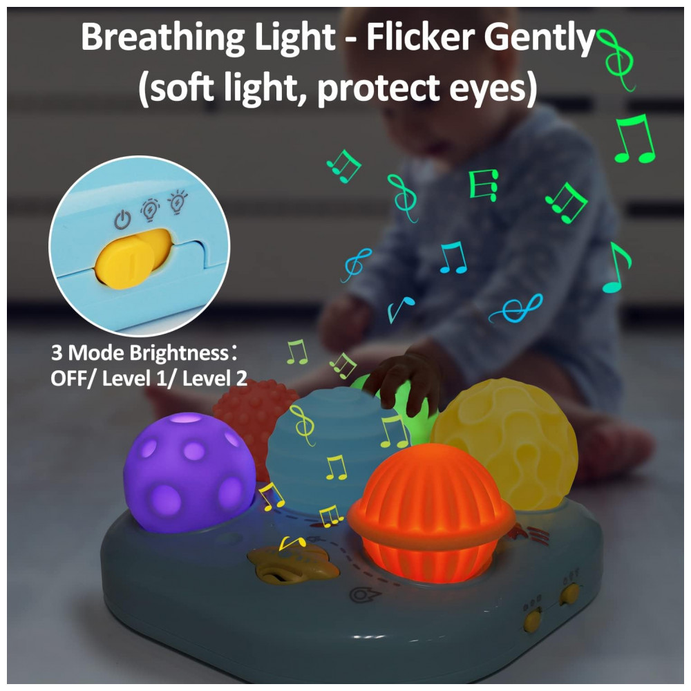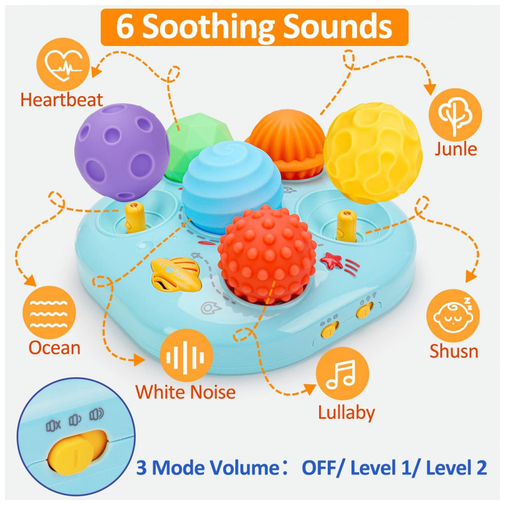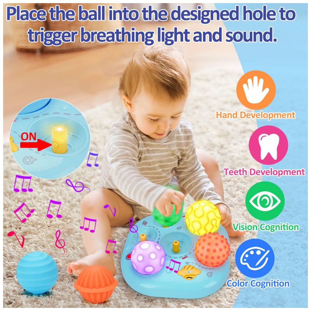 O brinquedo musical sensorial em formato de bola da Tsomtto combina módulo eletrônico de luzes suaves com 6 melodias e um conjunto de bolas macias coloridas, projetado para estimular visão, audição e tato em bebês. A base possui aberturas onde o bebê encaixa as bolas sensoriais; cada encaixe aciona luzes e sons diferentes, criando associação entre movimento, som e brilho em intensidade regulável. As bolas apresentam diferentes texturas e cores, podem ser destacadas e utilizadas separadamente para mordida e exploração tátil, apoiando o uso em momentos de brincadeira de bruços e rotina de sono.