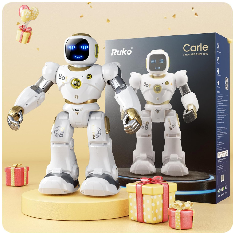 4 maneiras de controle para diferentes idades O robô inteligente Ruko Carle pode trabalhar através do aplicativo de telefone, controle remoto, comando de voz, sensor de gravidade de maneira fácil e adequada, o que se adapta a diferentes idades e também enriquece a mente do seu filho com os diferentes desafios interativos, como um grande companheiro