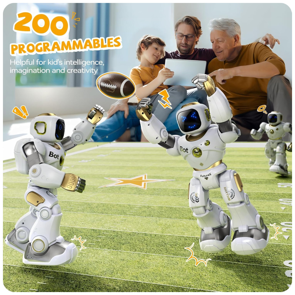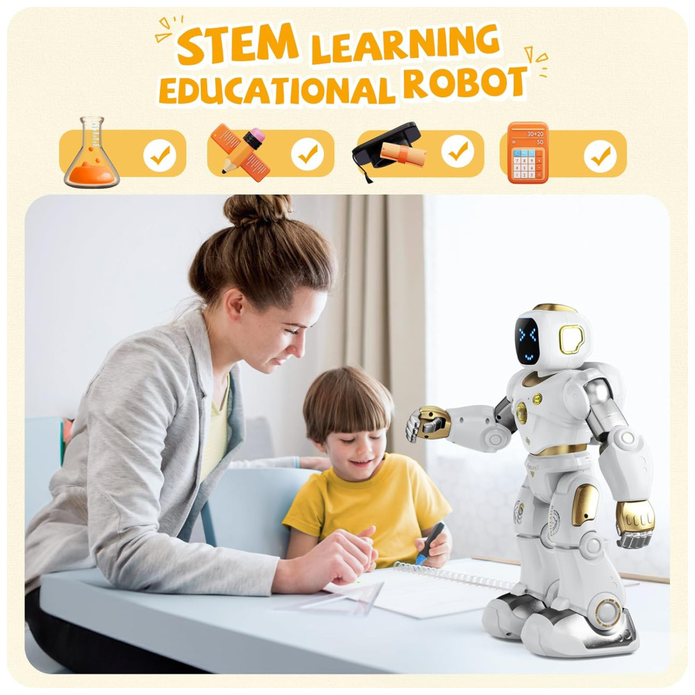 Simule o desempenho humano perfeitamente O rosto do LED varia em diferentes emojis para expressar seus sentimentos 9 motores poderosos garantem o robô para ações complicadas sem problemas este robô interativo responde ao tocar sua cabeça, simula bem as ações humanas e promove a interação com seus filhos, o que pode despertar a curiosidade do seu filho para interagir com o robô.