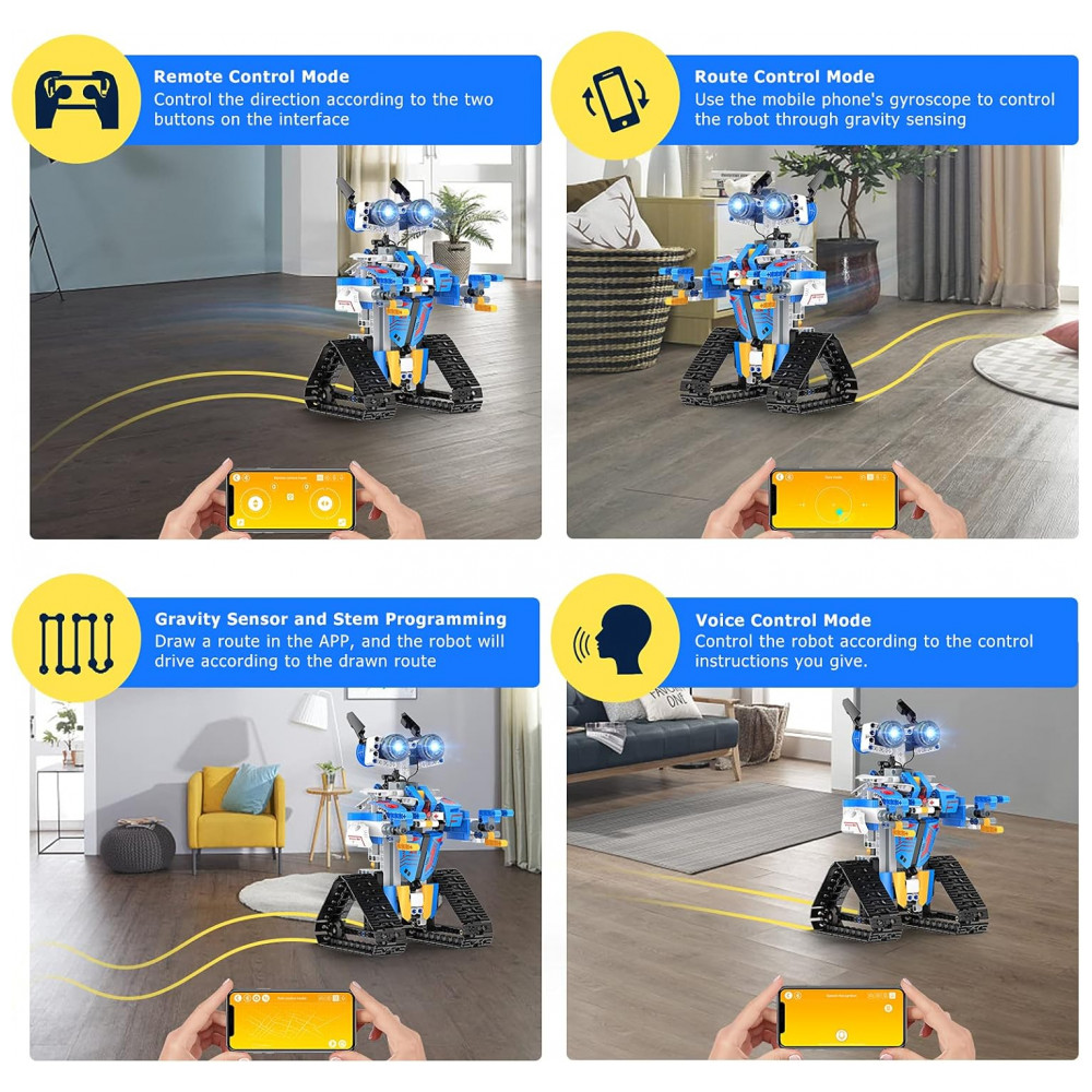 O kit de blocos de construção STEM da nossa marca vem com 468 peças e adesivos legais, proporcionando diversão na construção para meninos e meninas. Além de promover a coordenação motora e a habilidade prática, este brinquedo educativo STEM estimula a imaginação e melhora as habilidades motoras das crianças. Os robôs podem se mover em todas as direções, têm olhos brilhantes, juntas de mão flexíveis e capacidade de girar 360 graus, permitindo que as crianças explorem diferentes possibilidades. Ideal como presente de aniversário ou festival para crianças de 8 anos em diante. Controle o robô inteligente com o aplicativo de celular via Bluetooth ou com o controle remoto incluso, oferecendo diferentes modos de controle, como por voz, gravidade ou programação STEM. O design funcional e criativo facilita a montagem, com manual passo a passo colorido. Feito de materiais ABS seguros e duráveis, com bordas suaves para a segurança das crianças.