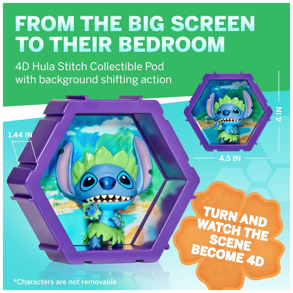 O Pods 4D Hula Stitch é um item colecionável da Disney com efeito 4D, proporcionando uma experiência mágica e única para os fãs de Stitch. Este pod é conectável e pode ser facilmente combinado com qualquer outro Pods 4D em segundos, permitindo que você projete e construa sua própria combinação única e exiba a em qualquer parede, prateleira, mesa ou parapeito de janela.