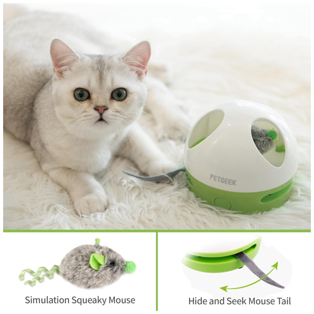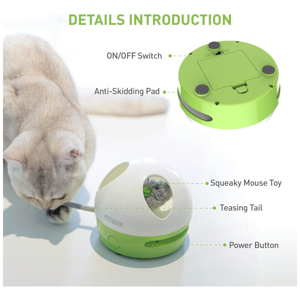BRINQUEDO DE GATO SQUEAKY COM CATNIP Os brinquedos interativos robóticos PETGEEK para gatos internos são equipados com um mouse super realista preenchido com catnip, pode fazer sons realistas do mouse após o cabo de plástico ser removido. E vai trazer diversão sem fim para o seu gato e mantê lo ocupado.