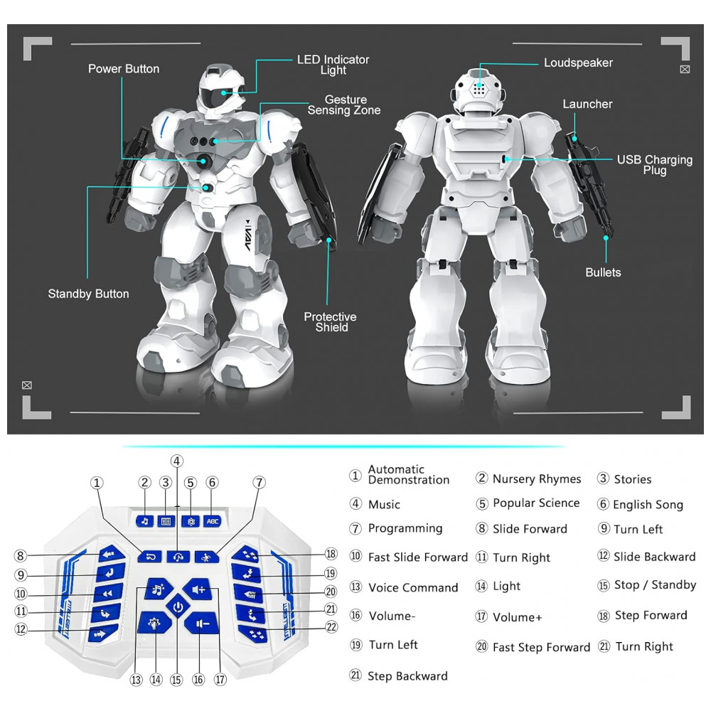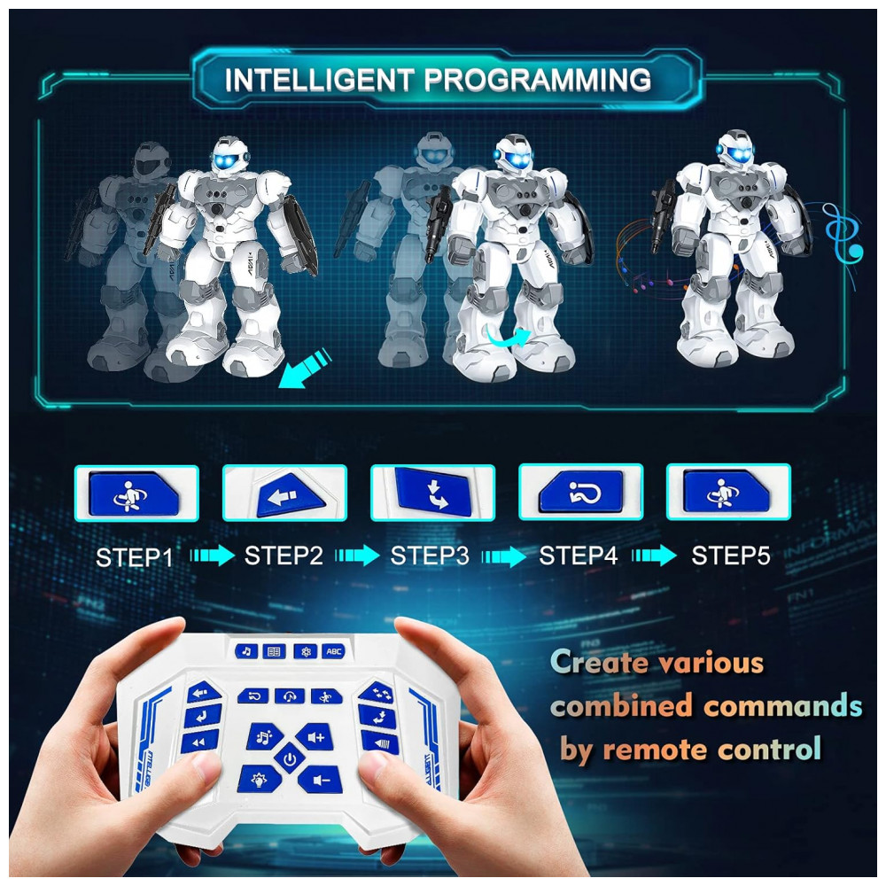 Controle Remoto por Sensor de Gestos: Este robô inteligente não apenas pode ser controlado pelo controle remoto, mas também pode responder rapidamente aos comandos de gestos, movendo-se para frente, para trás, para a esquerda e para a direita de acordo com os seus gestos. Programação Inteligente: O robô infantil pode ser programado via controle remoto. As crianças podem usar a imaginação para criar uma sequência de movimentos, como Deslizar para Frente, Virar para a Direita, Programação de Música, e o robô demonstrará essas ações passo a passo. Este robô interativo desenvolve muito a concentração e criatividade das crianças, sendo um ótimo brinquedo STEM para meninos e meninas de 6 a 10 anos. Design Atualizado e Legal: Maior do que a maioria dos robôs do mercado, este robô RC possui olhos de LED incríveis e voz encantadora, metralhadoras chamativas e escudo protetor. Além de ser um bom companheiro de brincadeira para as crianças, também é uma decoração de modelo requintada na casa. A aparência mais moderna certamente proporcionará uma experiência melhor para seus filhos. Brinquedos Robôs Recarregáveis via USB: Este robô eletrônico é alimentado por bateria interna, com porta USB que pode ser conectada diretamente ao adaptador, power bank, laptop, carregador de carro, etc. Com apenas 1 hora de carga, seus filhos podem aproveitar cerca de 60 minutos de diversão. Presentes Incríveis para Crianças: Os robôs educativos são brinquedos STEM ideais para crianças de 6 a 12 anos. Presentes de Natal perfeitos e presentes de aniversário para meninos e meninas de 6 a 10 anos, leve para casa e desfrute de momentos maravilhosos pais e filhos com seus filhos.